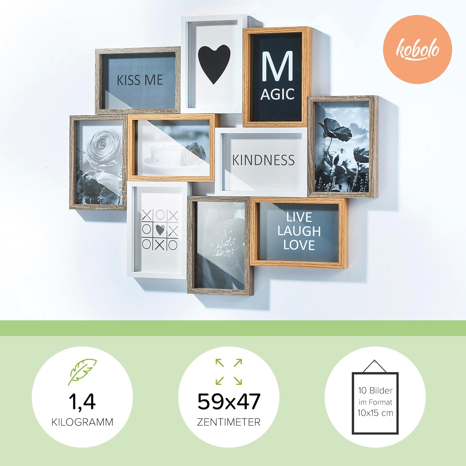 Kobolo Bilderrahmen-Collage - HEART- Holz - weiss natur - 10 Bilder - 59x47 cm
