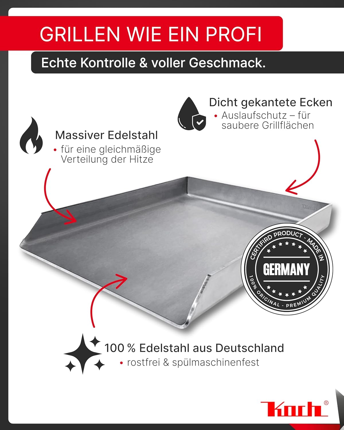 • ►Grillen Sie ab jetzt auf einem neuen Level mit einer Plancha von KOCH! Es gibt damit so viel mehr Möglichkeiten, die wunderbarsten Gerichte auf Ihrem Grill zuzubereiten – Steaks und Burger gelingen wie nie vorher und Gemüse fällt nicht mehr durch