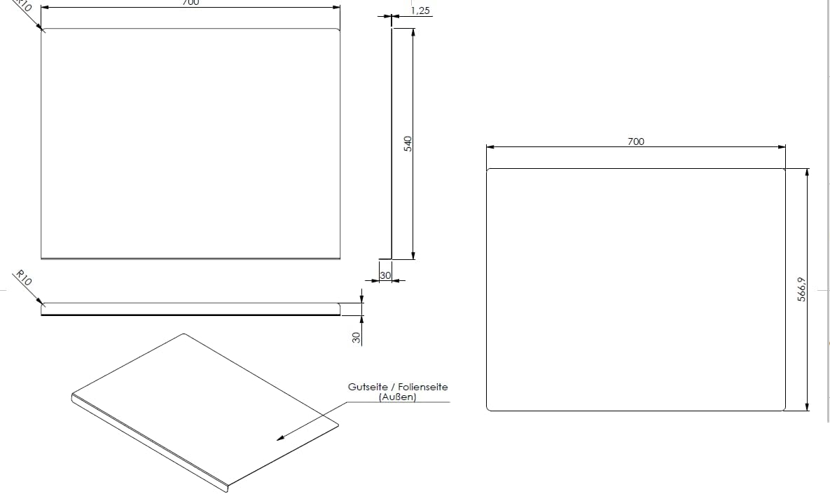 - ► Masse: 700 x 540 x 30 x 1,25mm (Breite x Tiefe x Höhe vordere Kantung x Stärke) - Edles Design mit geschliffener Sichtseite (Korn 400)