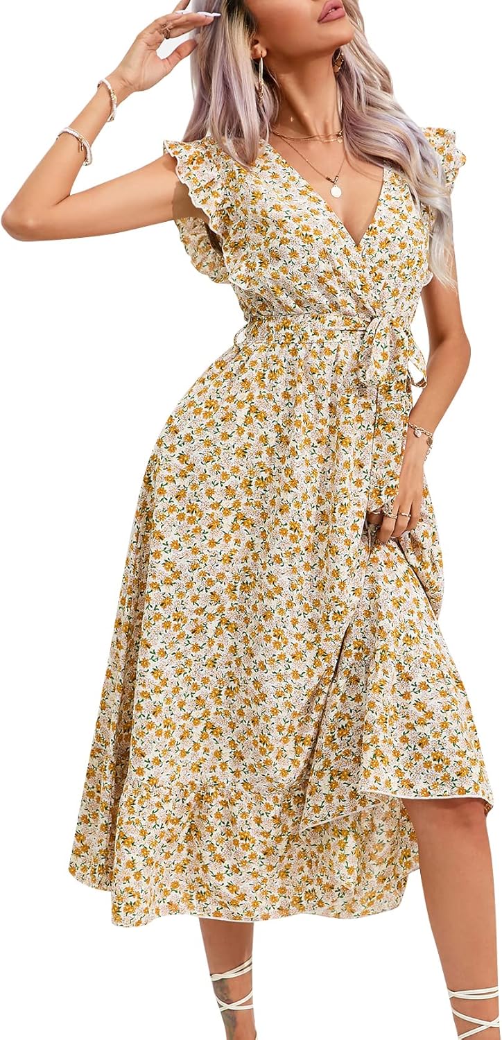 - ➤Style---Rüschen ✚ Schmetterlingsärmel ✚ V-Ausschnitt ✚ Hohe Taille ✚ mit Gürtel Perfekt als alltagskleid und zeigen einen eleganten weiblichen Charme.
