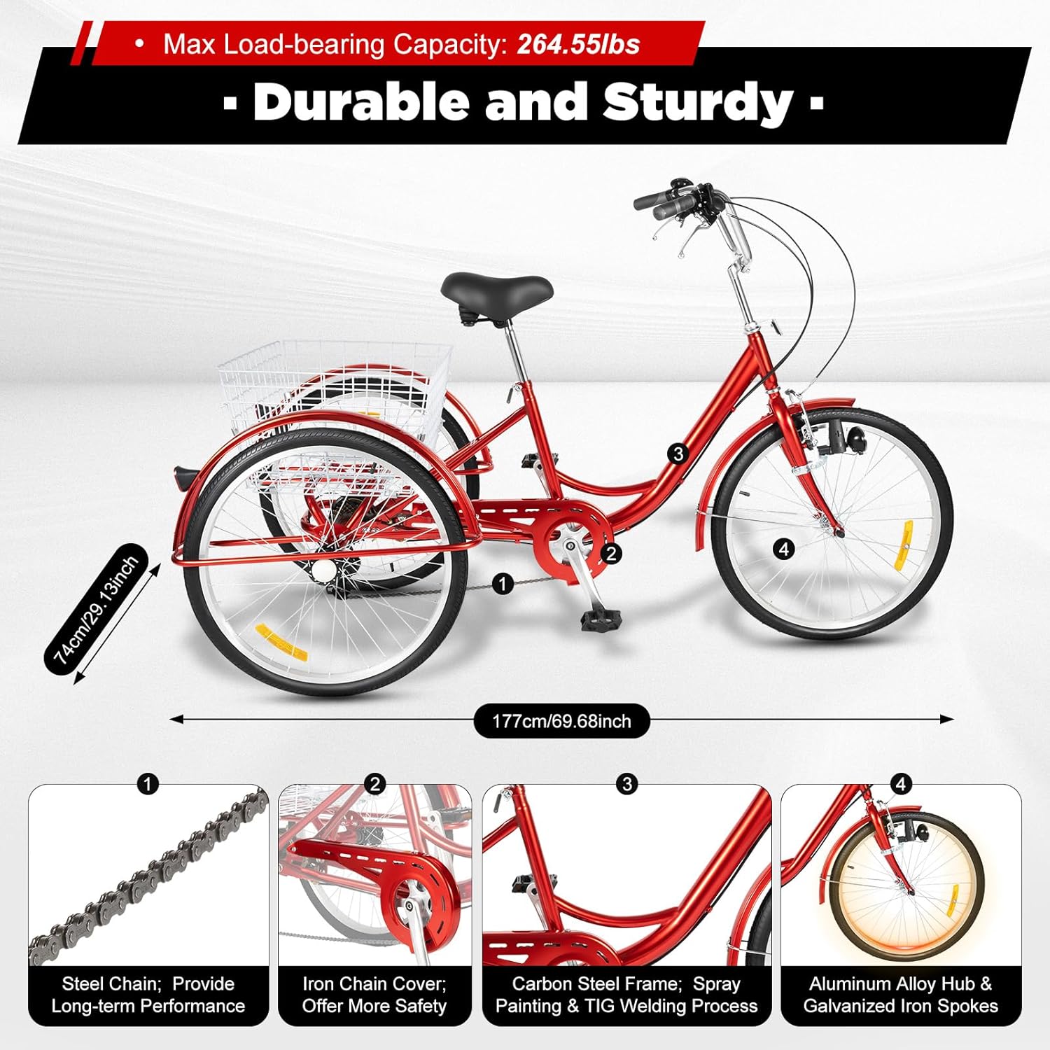 - 🚲【Sicheres Fahren】Das Trike besteht aus einem TIG-geschweissten Rahmen aus hochfestem Stahl, einer Einzelkurbel aus Aluminium und einem Kettenschutz aus Stahl. Alu-Bremsen vorne und hinten machen das Fahrrad sicherer und stabiler.