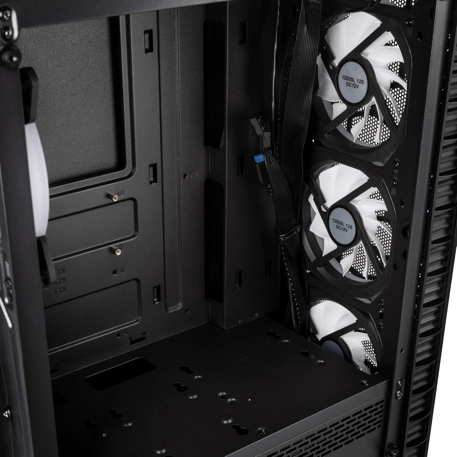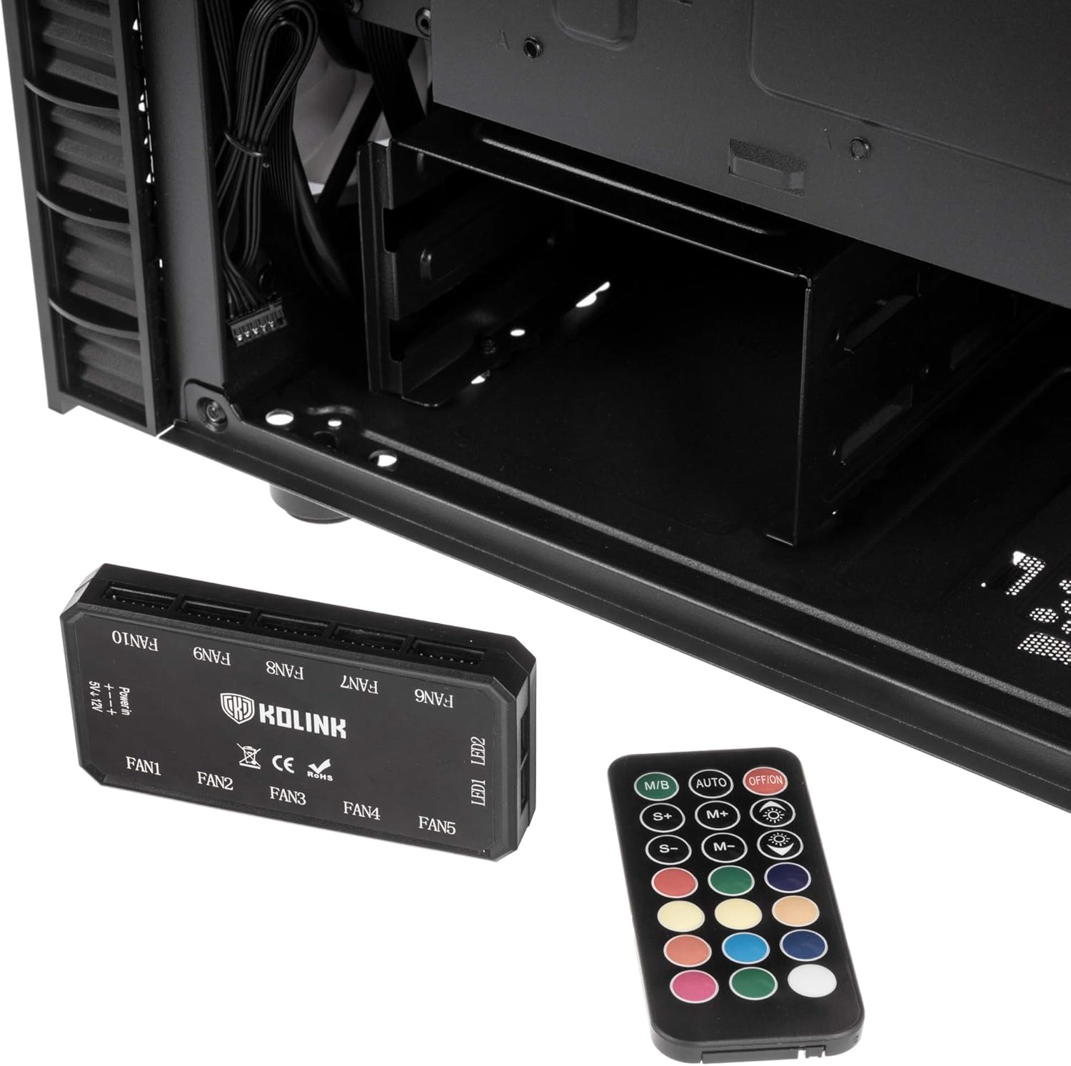- RGB CASE, RGB TOWER; Die im RGB-Case installierten ARGB-LED-Lüfter können von einer integrierten Steuerung gesteuert werden, einschliesslich einer Fernbedienung, die eine Vielzahl von Beleuchtungsoptionen und -modi bietet und sogar die Steuerung der