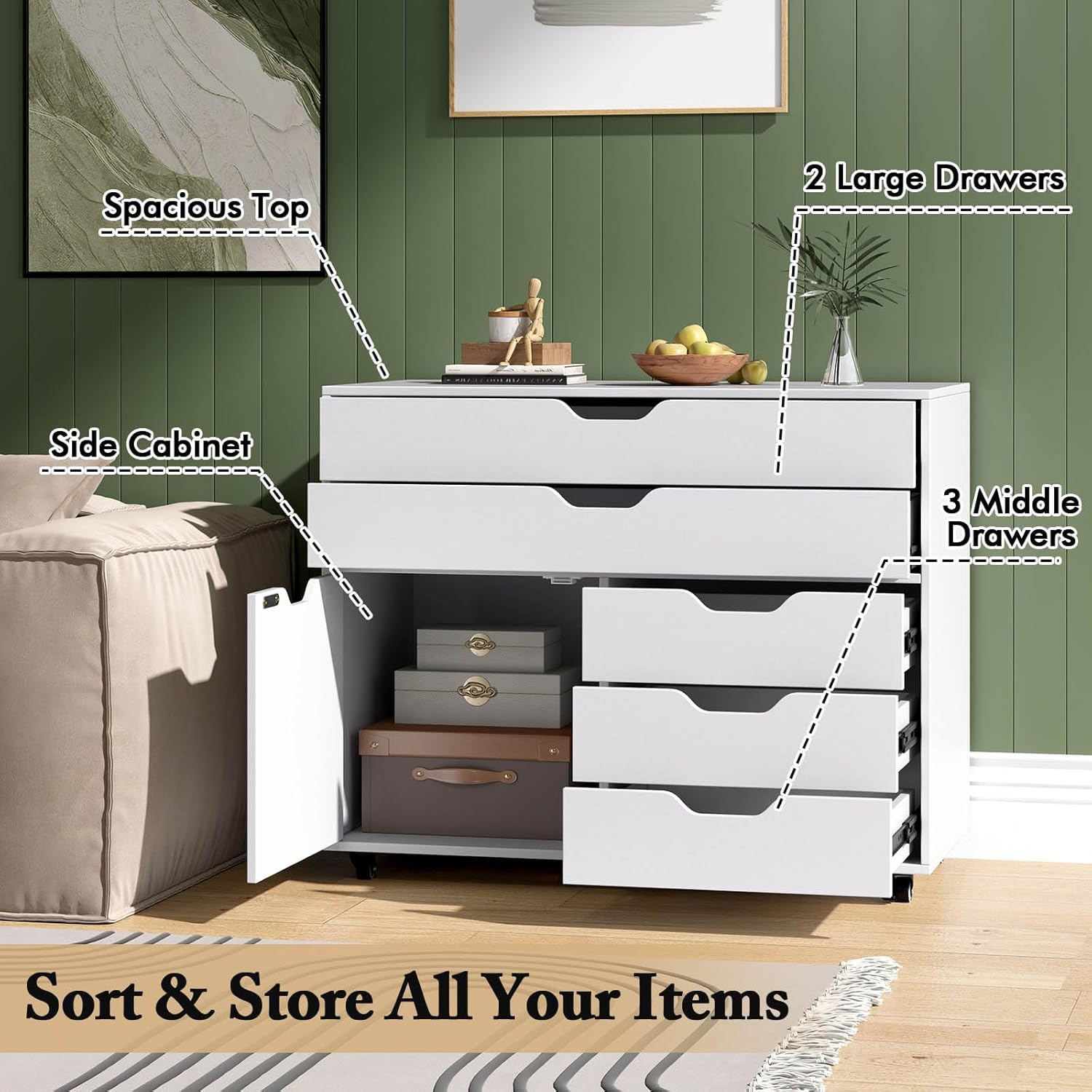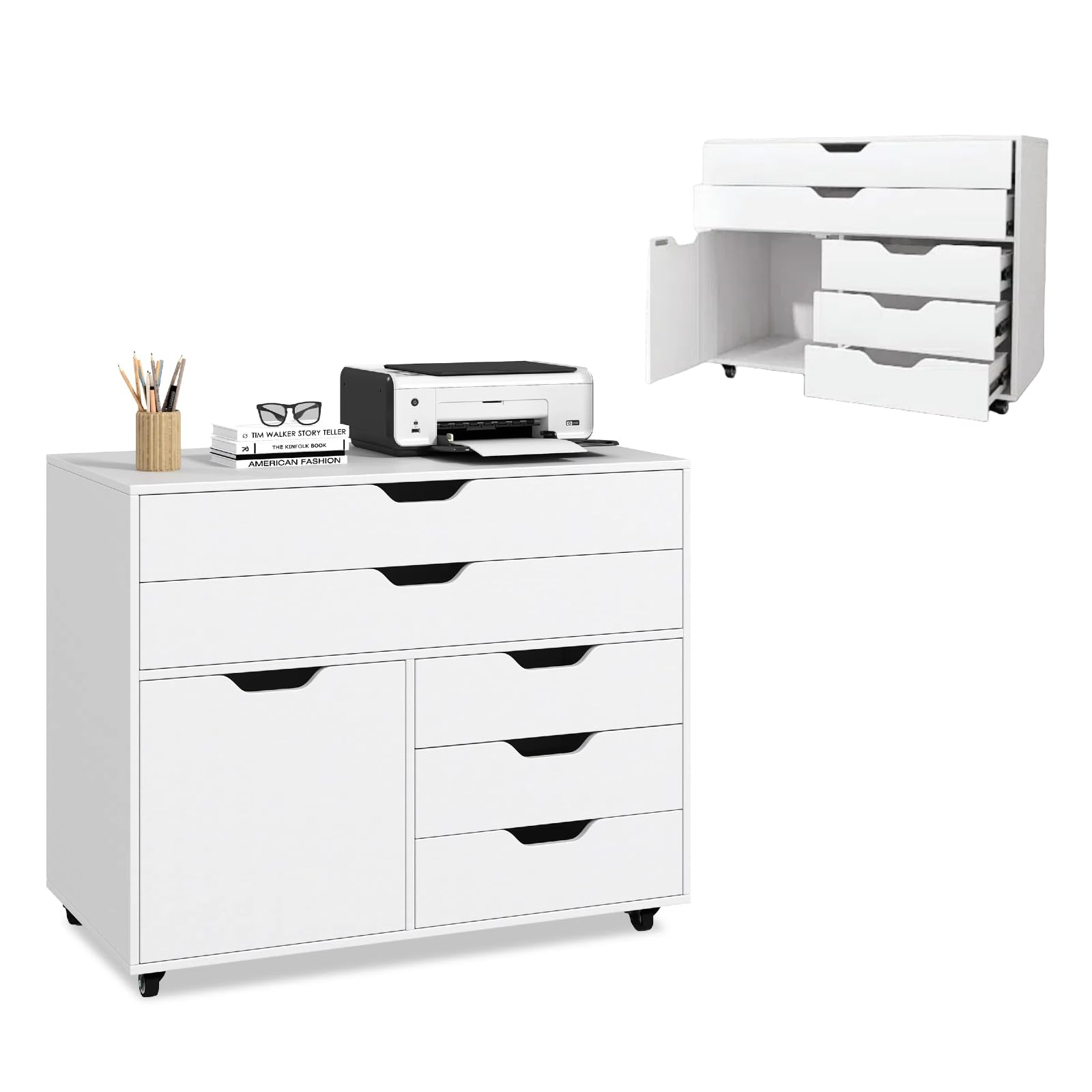 • MULTIFUNKTIONALER LAGERRAUM: Dieser Aktenschrank verfügt über 5 Schubladen in 2 Grössen, die sich perfekt für die Aufbewahrung einer Vielzahl von Schreibwaren, Akten und Bürobedarf eignen. Ausserdem gibt es einen Schrank mit einer Tür mit grossem
