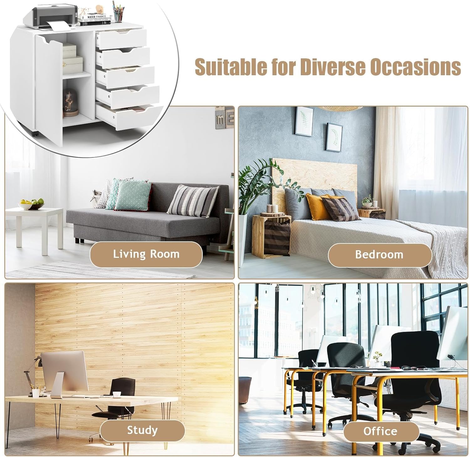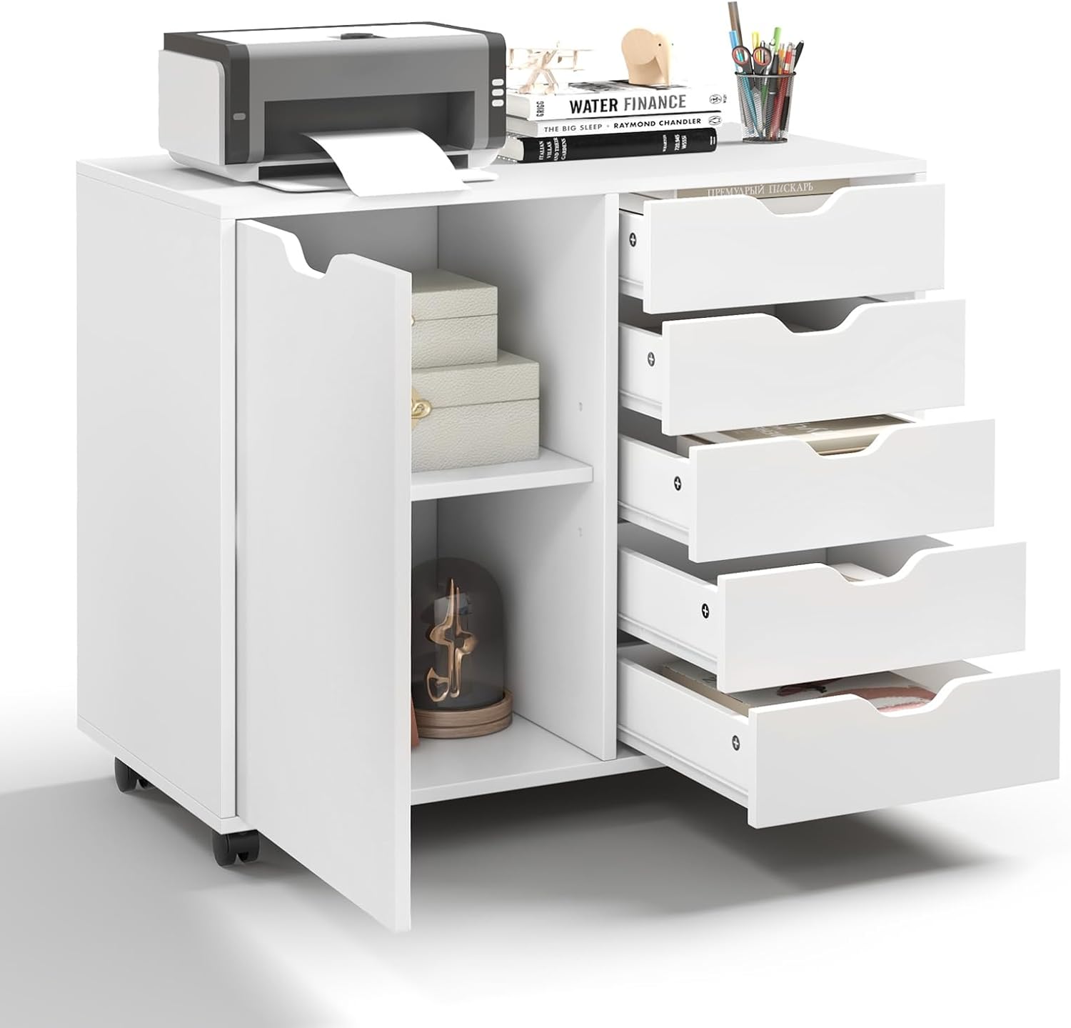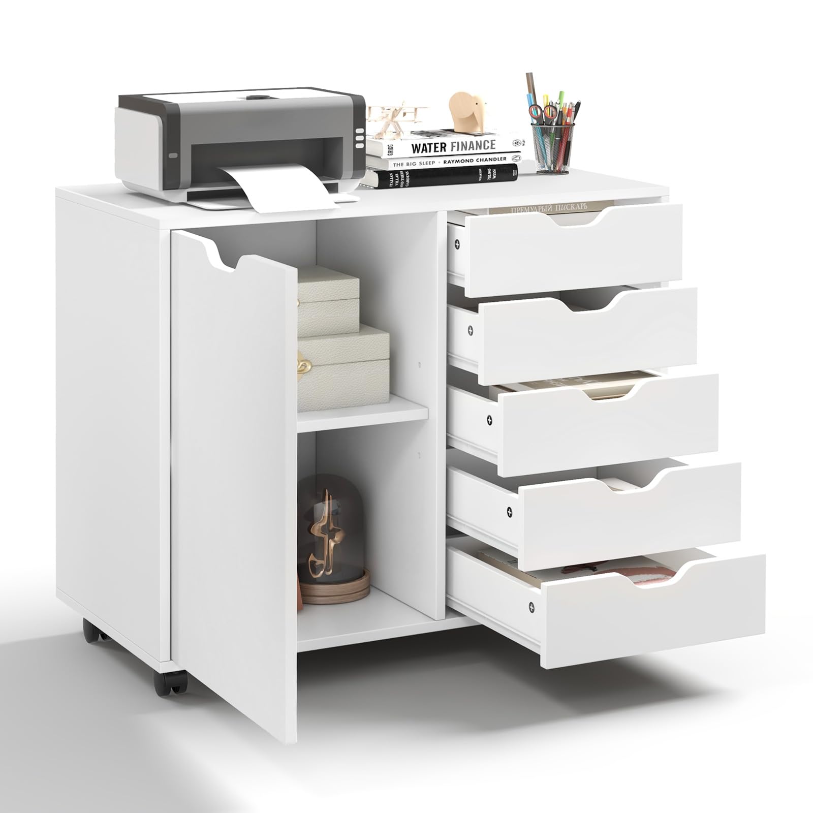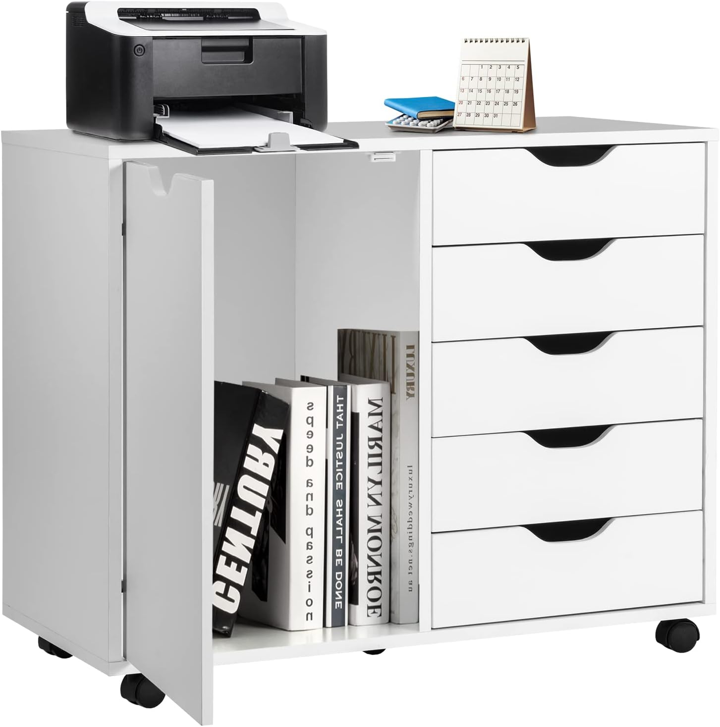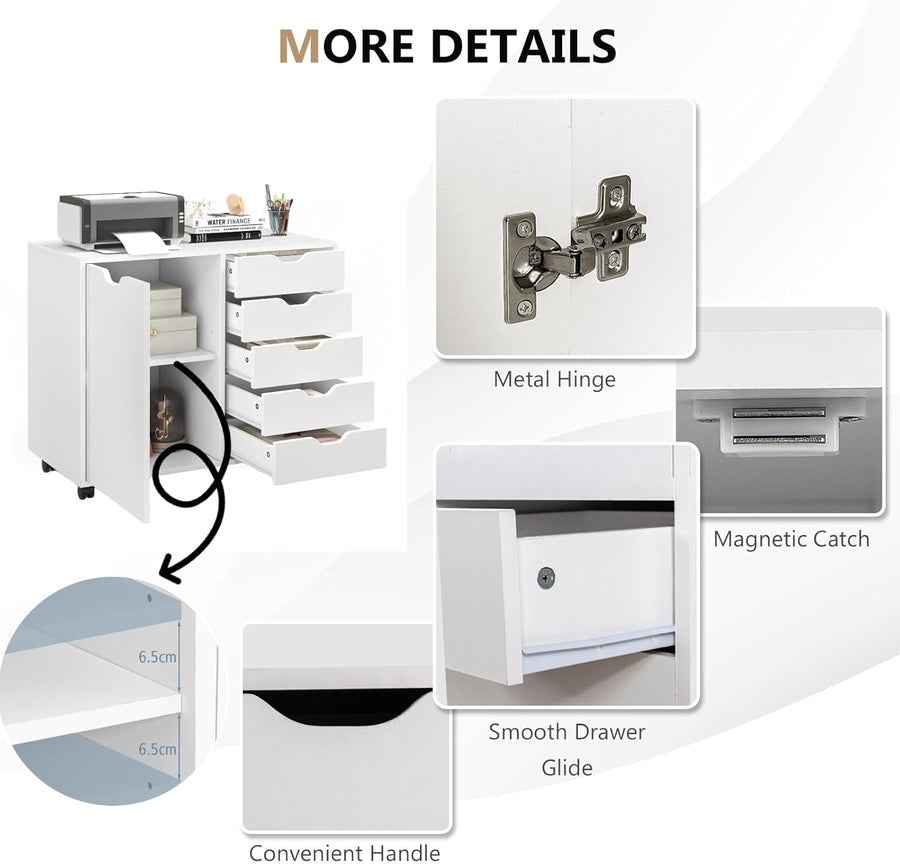- 🖨️MULTIFUNKTIONALER STAURAUM: 5 Schubladen sind ideal für die Aufbewahrung verschiedener Schreibwaren und Bürobedarf sowie ein grosszügiges Tablett für einen Drucker. Der grosse Türschrank bietet idealen Platz für Bücher oder Dokumente.