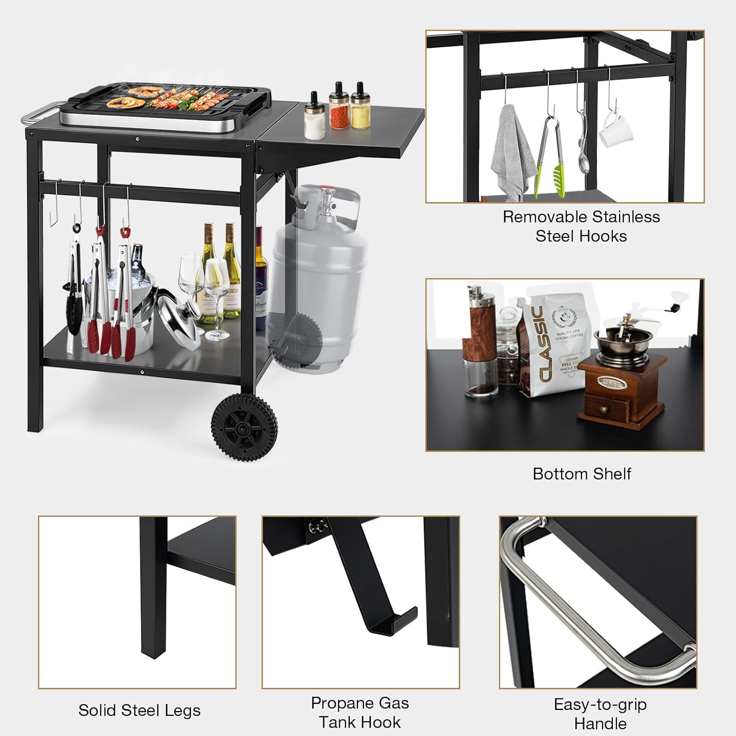- 🥩EINFACH ZU MONTIEREN & ZU REINIGEN: Dieser Grillwagen wird mit einer übersichtlichen Bedienungsanleitung und allem notwendigen Zubehör geliefert, einfach und schnell zu montieren gemäss den Codes im Handbuch. Darüber hinaus ist die glatte