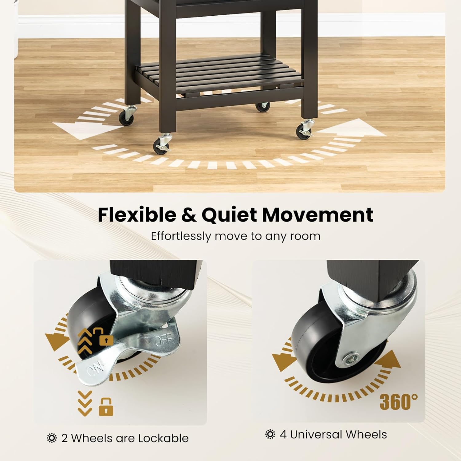 - 🥂FLEXIBLES MOBILES DESIGN: Mit den 4 360° drehbaren Rollen lässt sich dieser Wagen mühelos bewegen und schützt gleichzeitig den Boden. Dank der zwei feststellbaren Räder kann er bei Bedarf auch fest fixiert werden.