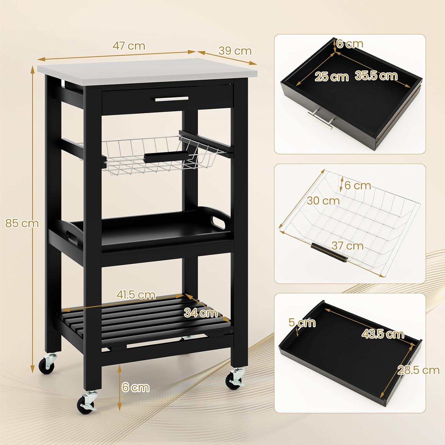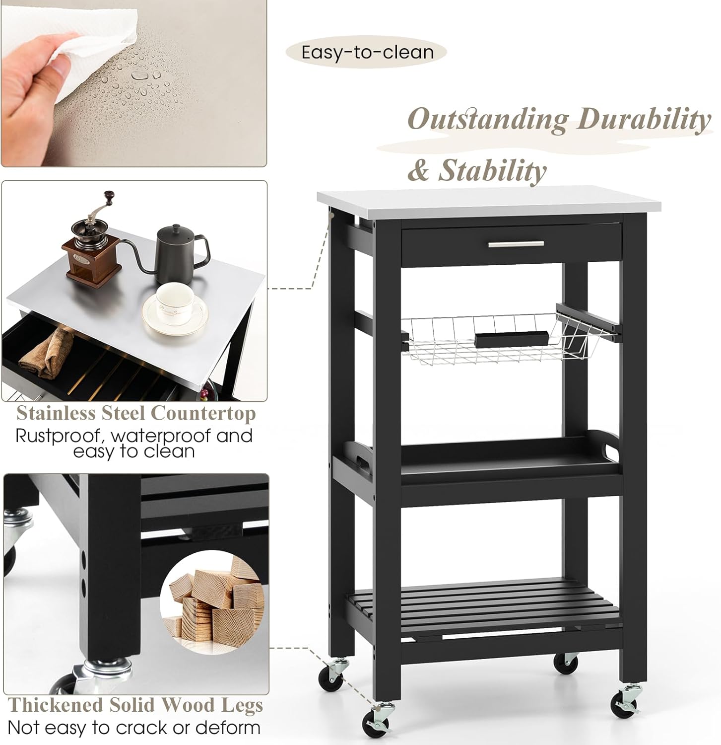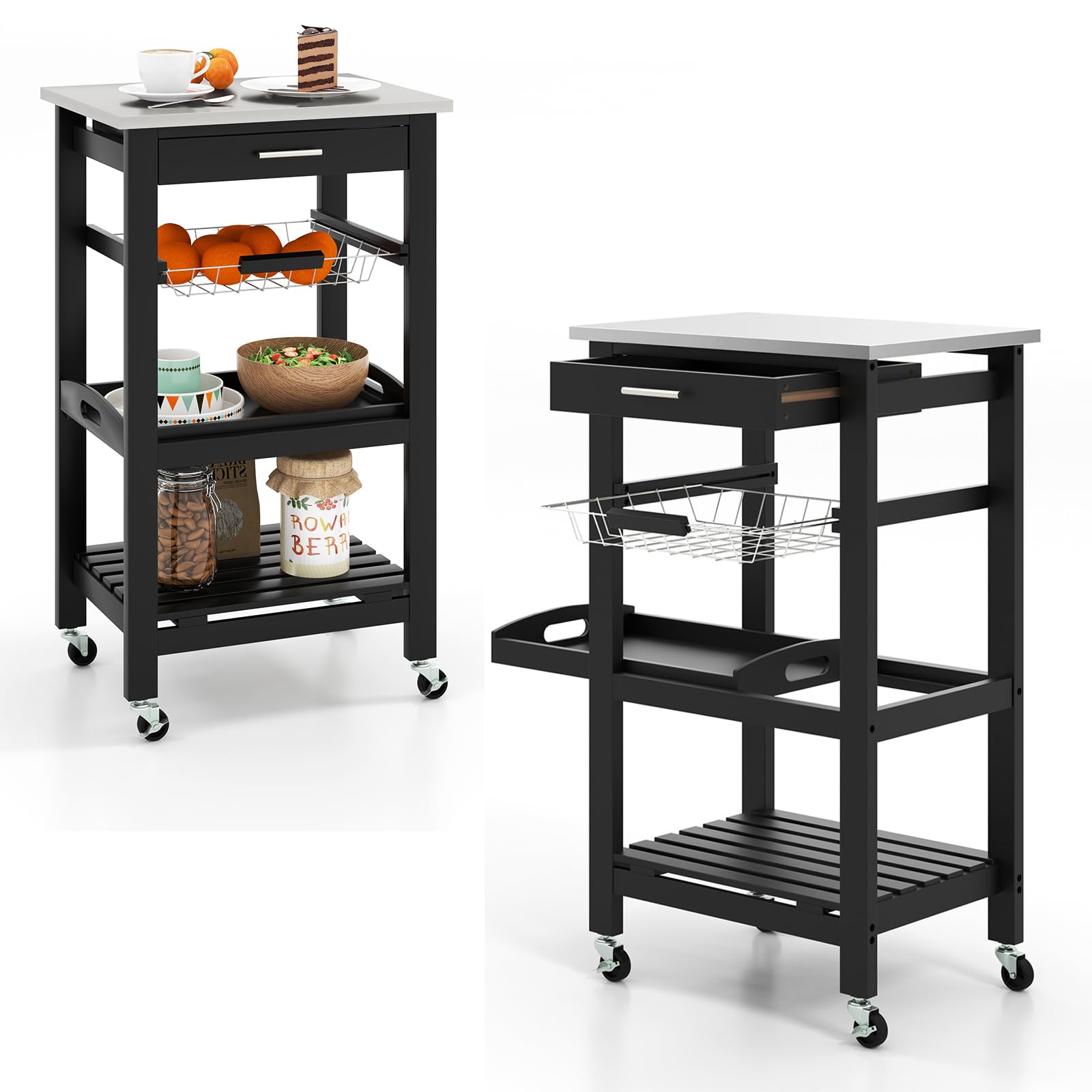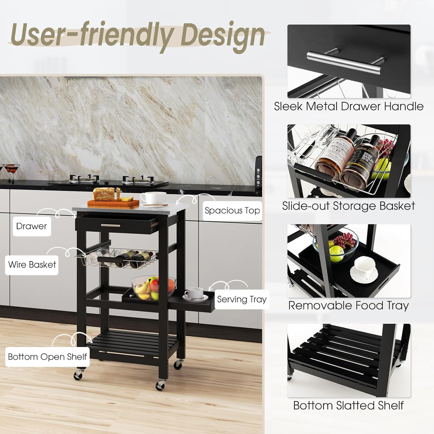 - 🥂GERÄUMIGER STAURAUM: Dieser Küchenwagen verfügt über eine breite Arbeitsplatte, eine Schiebeschublade, einen Metallkorb, eine abnehmbare Servierplatte und ein offenes unteres Regal für ausreichend Stauraum.