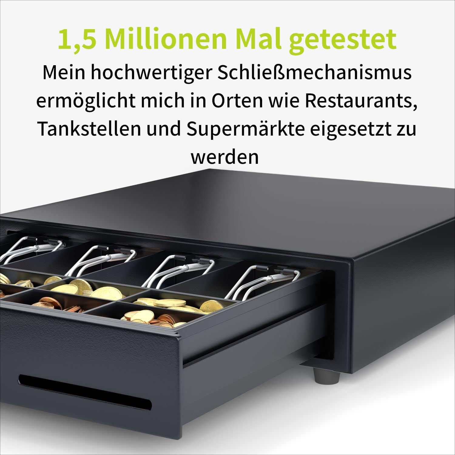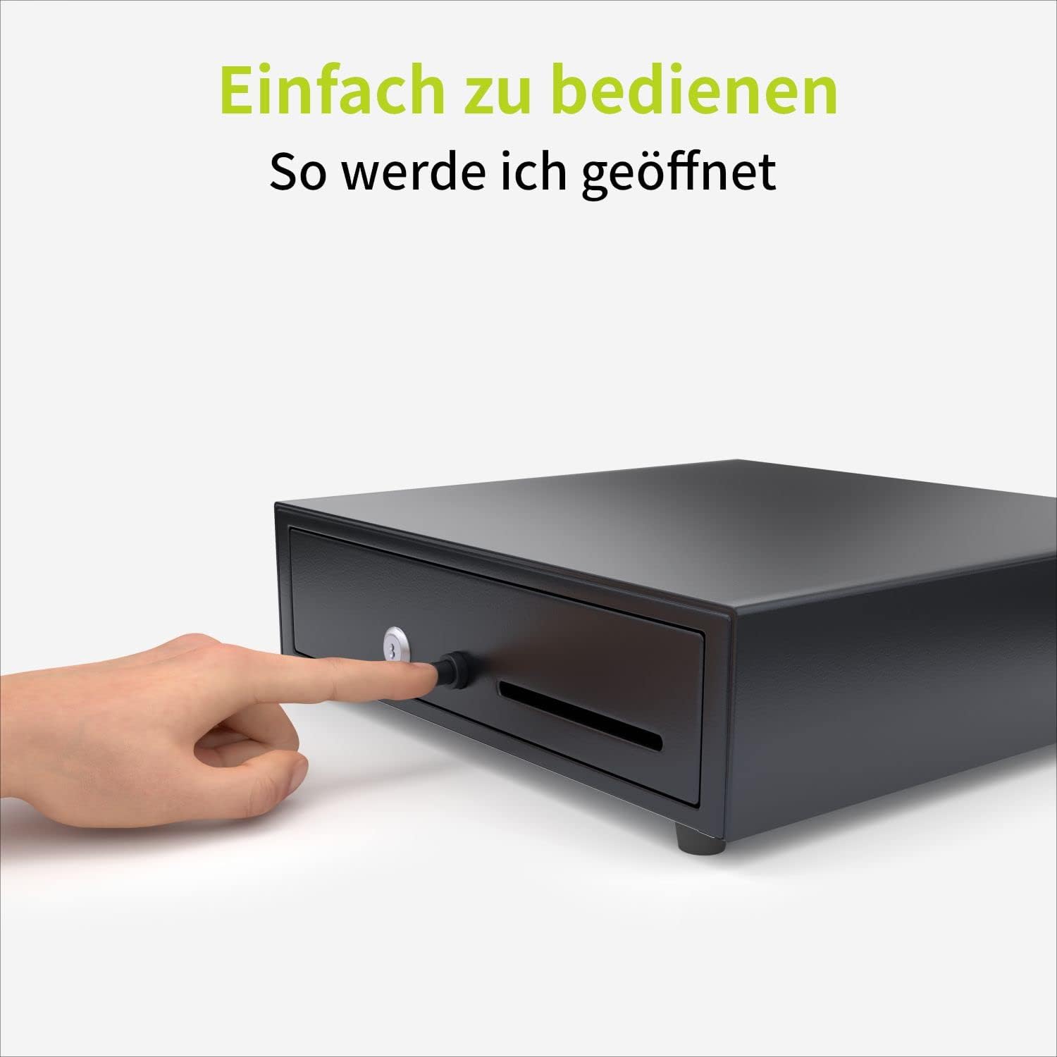 - Kassenlade Manuell - Öffnung der Kassenschublade manuell durch drücken auf den Druckknopf. Kein Strom nötig. Getestet auf mindestens 1.5 Millionen Öffnungen!