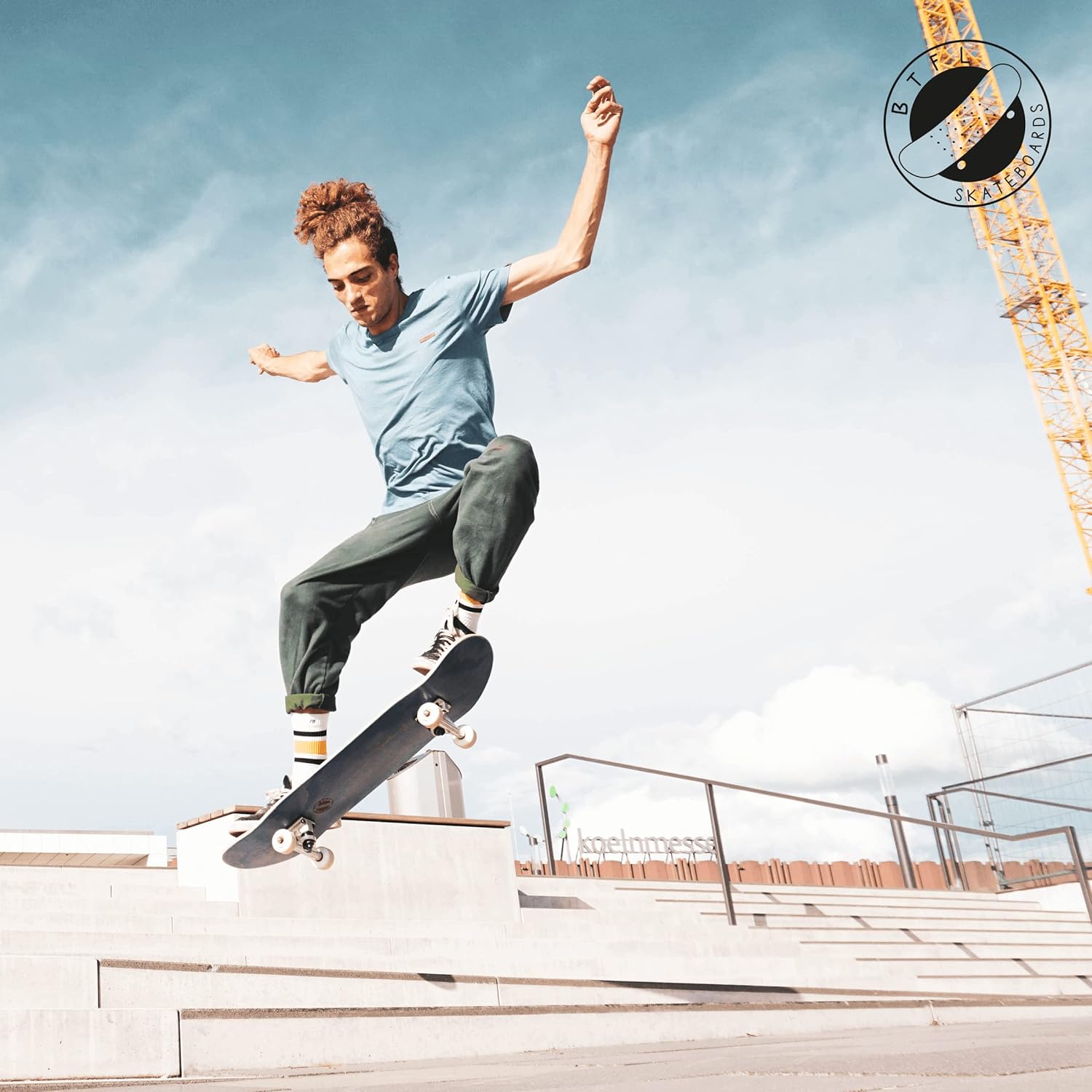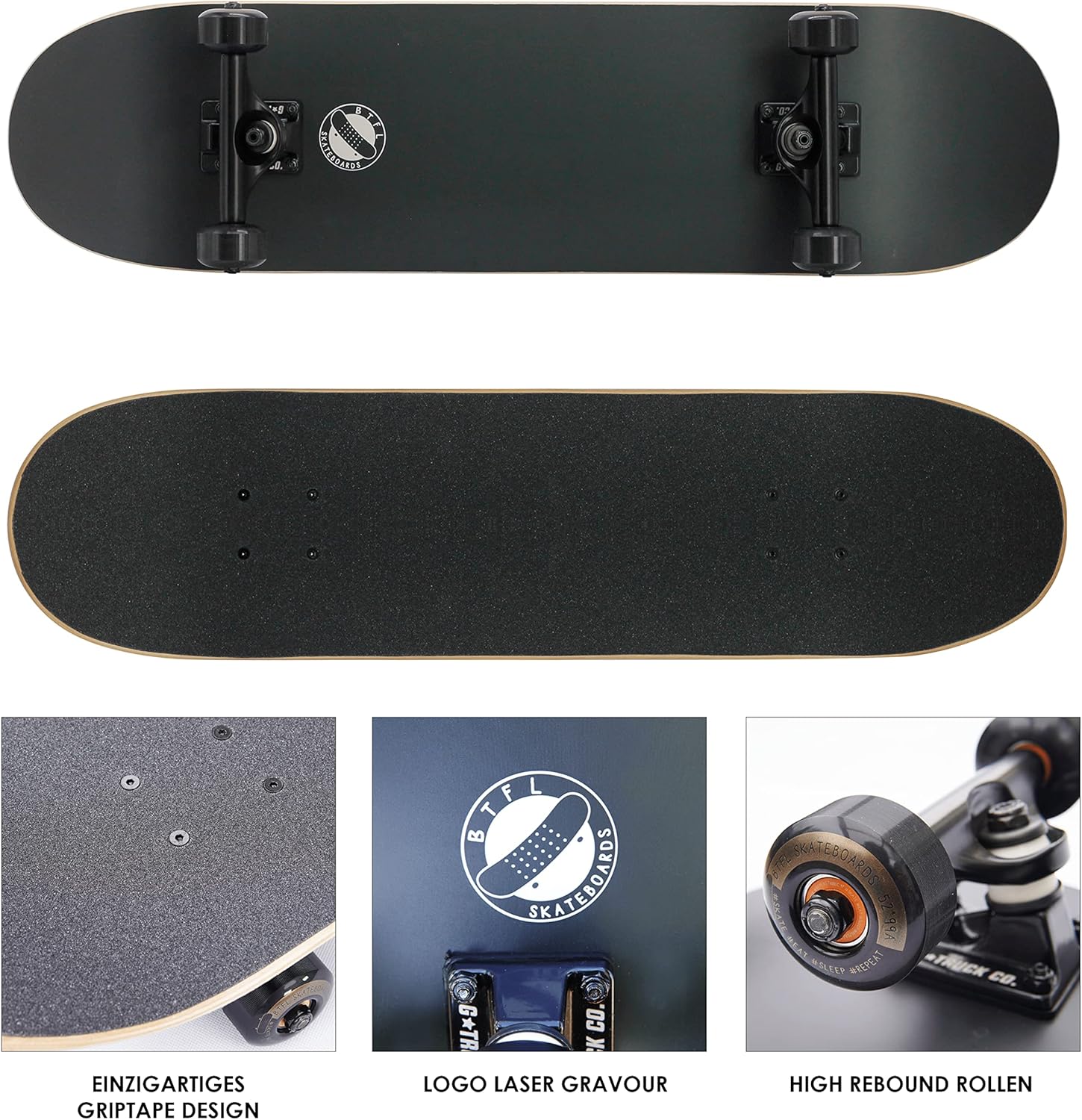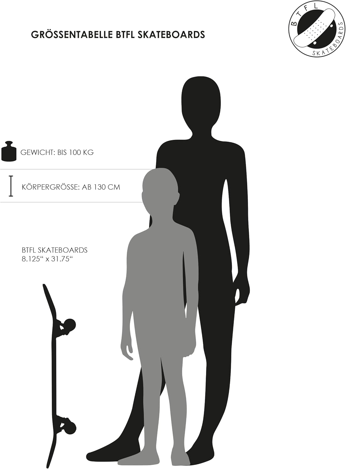 - Sofort einsatzbereit: Fertig montiert und perfekt abgestimmt – Dein BTFL Komplett Skateboard ist sofort bereit, um loszulegen. Das Komplett Skateboard kommt mit einem 8.125" x 31.75" grossen Deck, leichten 5.25" G-Truck Hollow Achsen und 52mm