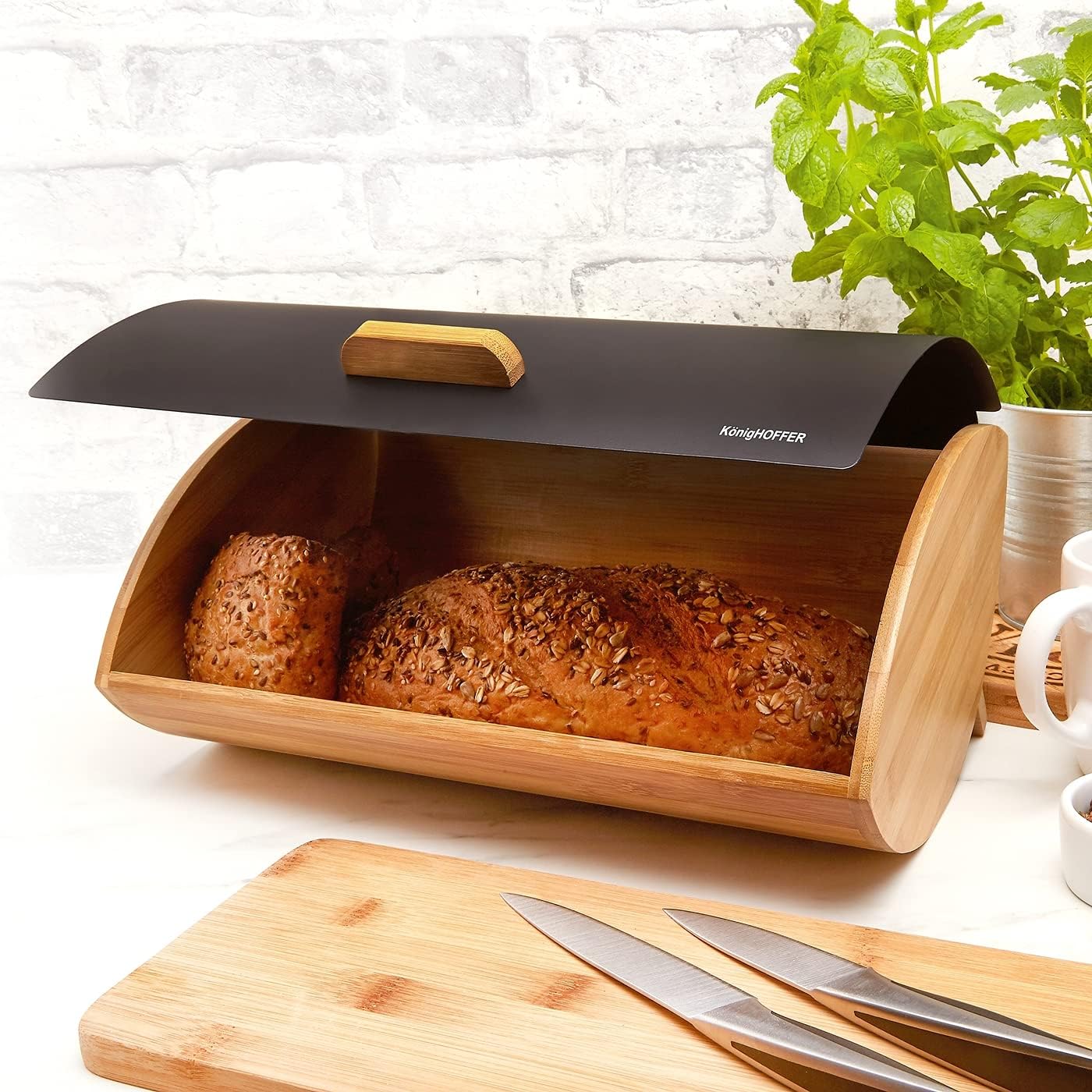 - Eine Kombination aus Bambusholz und Karbonstahl (lackiert). Die renommierte deutsche Marke KönigHOFFER ist für das Design und die Produktion dieses Brotkorbs . Originelles Design ist nur eine der Stärken dieses Modells. Es zeichnet sich zudem durch