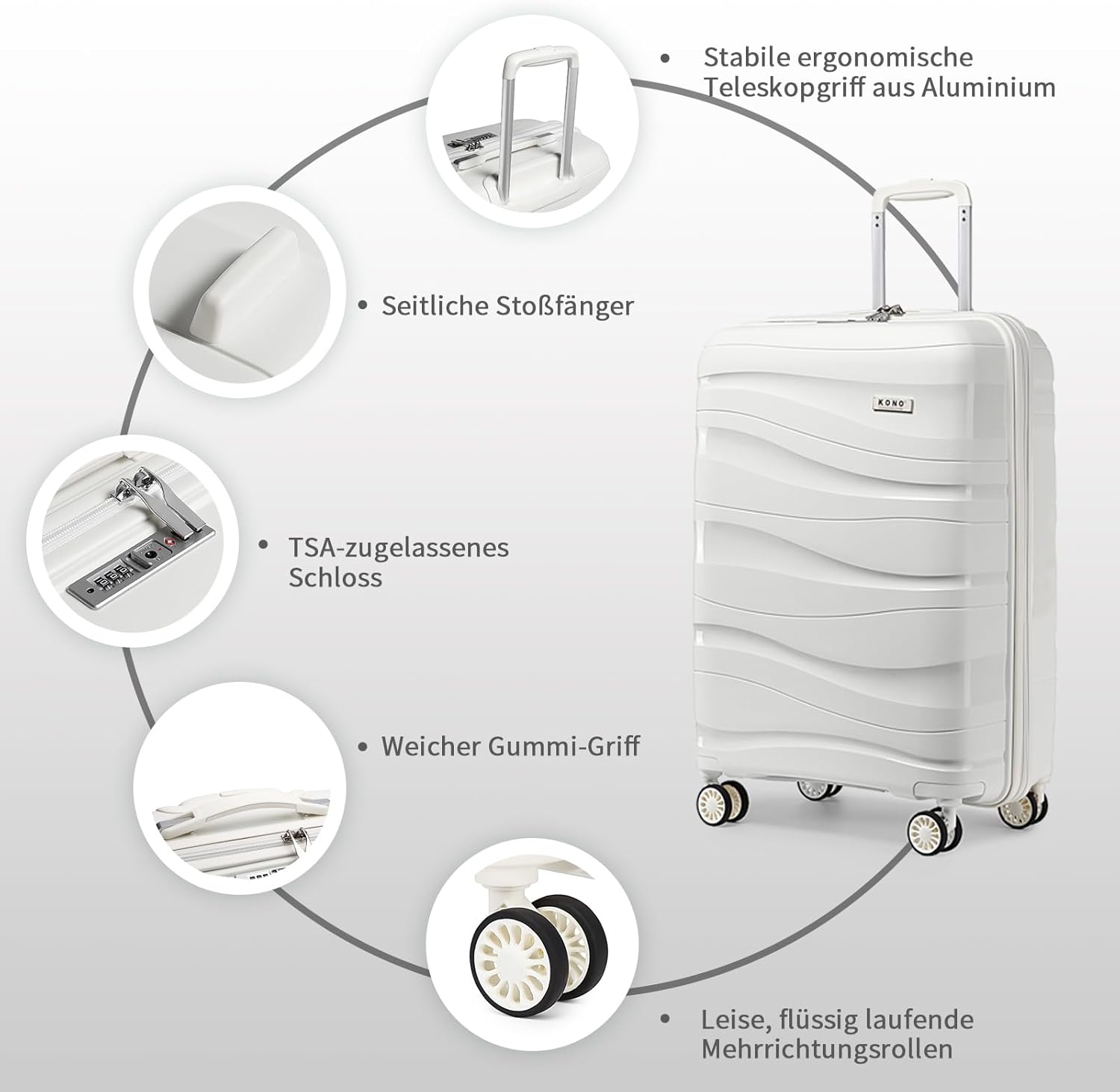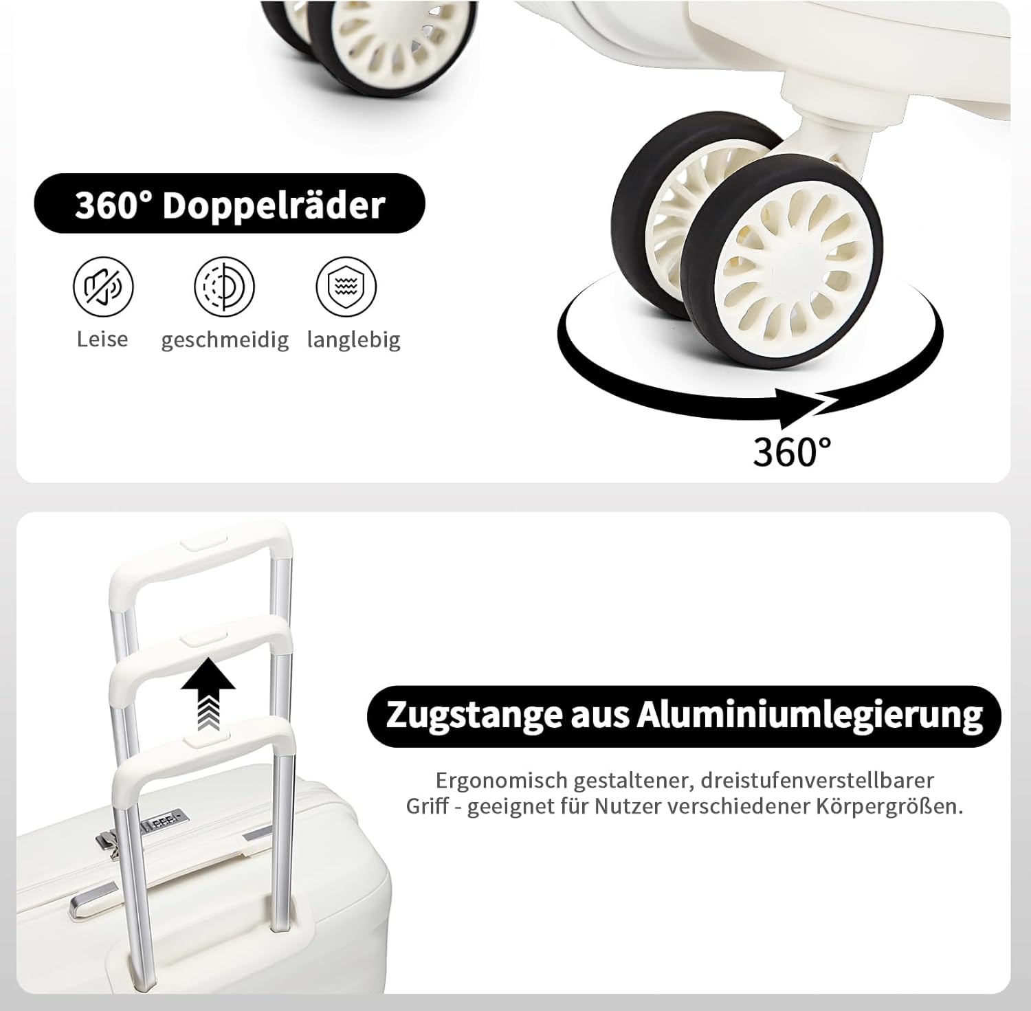 - Leise Spinner-Räder + Aluminium-Teleskopgriff + kurzer Griff: Profitieren Sie von neuen weichen TPE und Schmierkugeln in den Rädern, der Reisekoffer bewegt sich sehr leise und reibungslos mit 360° drehbaren Doppelrollen. Der Aluminium-Teleskopgriff