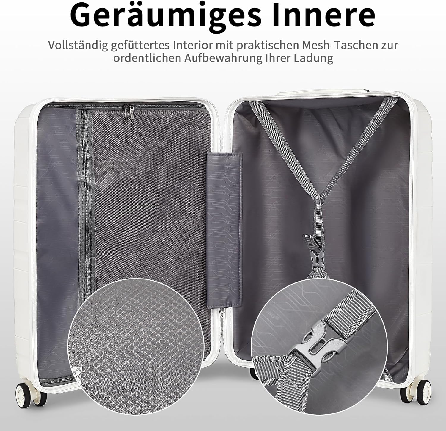 - Organisierte Fächer: Das Innere des Koffers ist mit Netztasche, Reissverschluss-Trennwand und Kreuzgurt ausgestattet, um Ihre Packkraft zu maximieren und Sie können Ihre Sachen vernünftiger packen. Die Kosmetiktasche mit grosser Kapazität kann zur