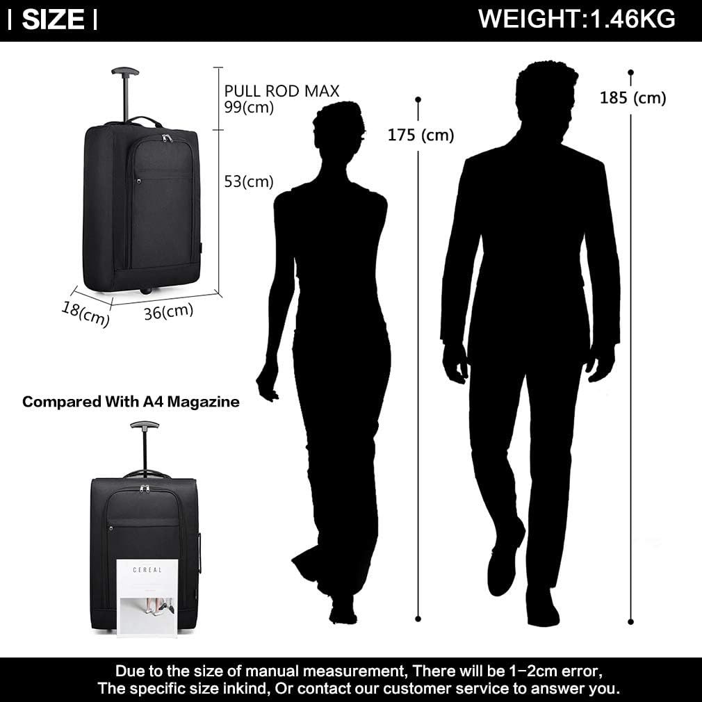 - Grösse (alle Teile): das Handgepäck: 53 x 36 x 18 cm ; 1,46 kg. Geeignet für die Verwendung als Handgepäck bei den meisten Fluggesellschaften, z. B. Lufthansa Eurowings Ryanair etc. Die kleine Umhängetasche: 35 x 20 x 20 cm ; 0,3 kg.