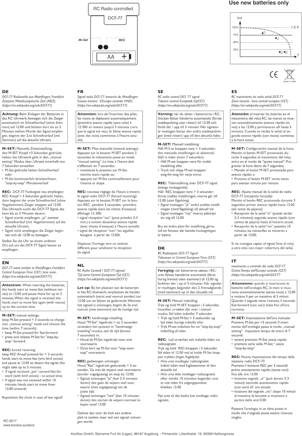 • RC-Funkquarzwerk (MEZ), der Zeitzeichensender DCF77 sendet die MEZ im Sekundentakt - das Empfangen des Zeitzeichens kann nicht abgeschaltet werden.