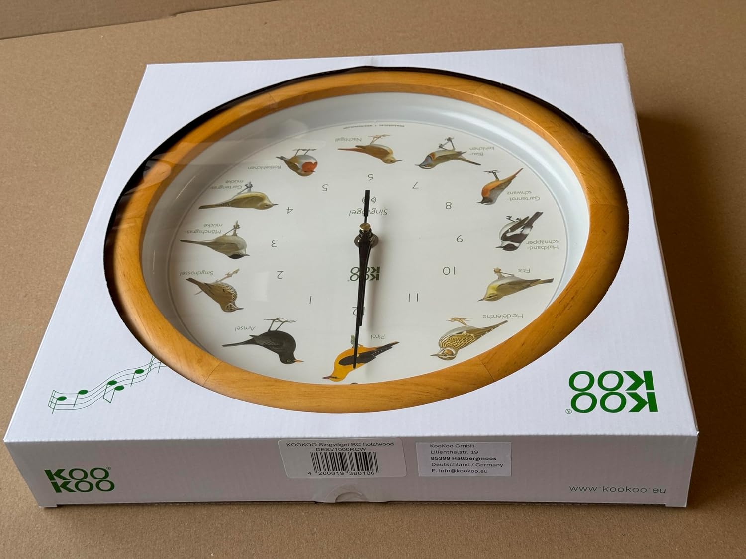 KOOKOO Singvögel Holz, Die Singende Vogeluhr, mit 12 heimischen Singvögeln und echten, natürlichen V