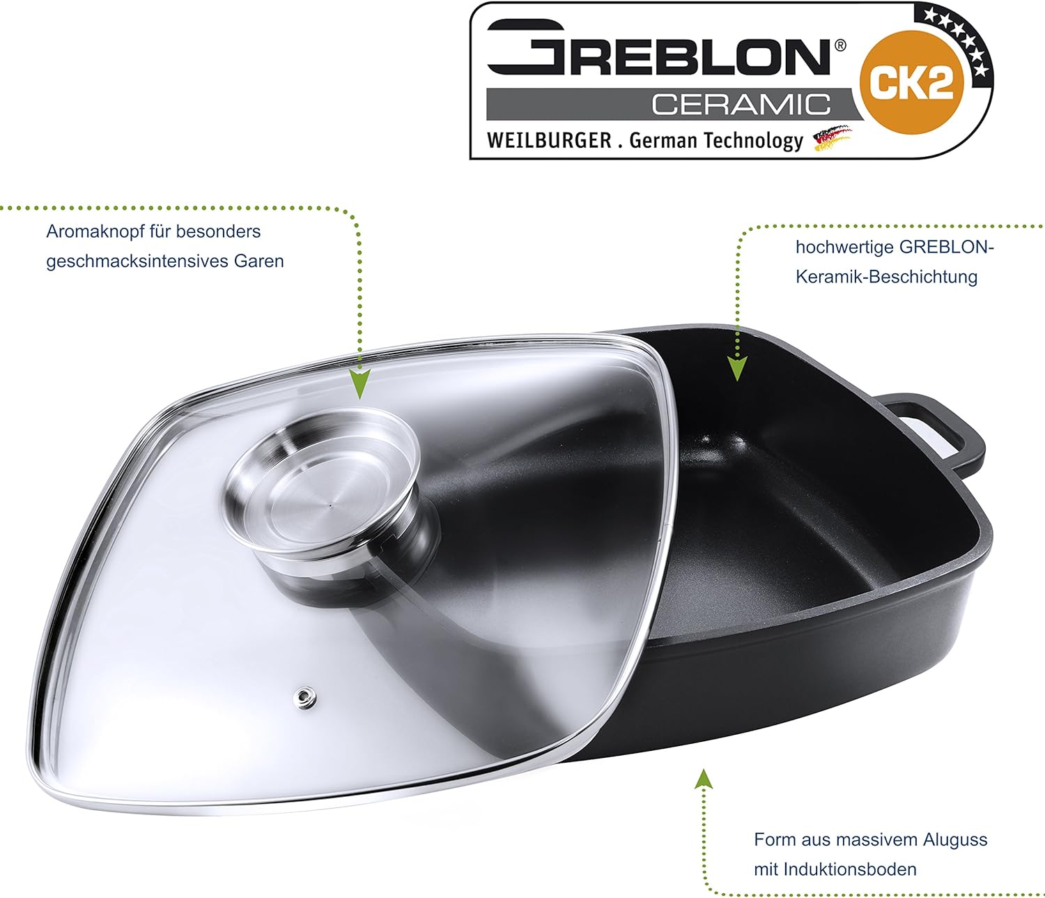 - Typ: Aluguss Schmortopf inkl. Glasdeckel mit Aromaknopf zum professionellen Aromatisieren Ihrer Gerichte - auch als Auflaufform zu verwenden