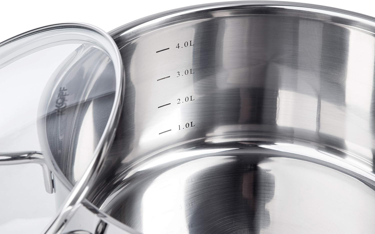 - Material: Aus hochwertigem 18/10-Hochglanz-Edelstahl; formstabil, geschmacksneutral und pflegeleicht; verkapselter Sandwichboden, Gesamtbodenstärke: 3,5 mm, Wandstärke: 0,6 mm