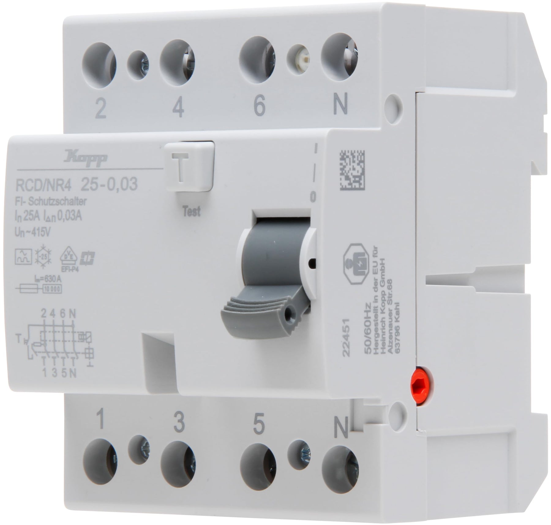 - Fehlerstromschutzschalter RCD, 4-polig, 25 Ampere/0,03 Ampere