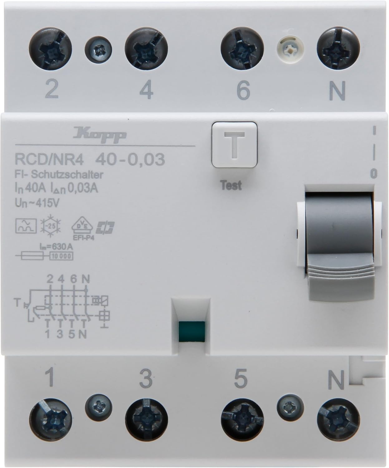 - Fehlerstromschutzschalter RCD, 4-polig, 40 Ampere/0,03 Ampere