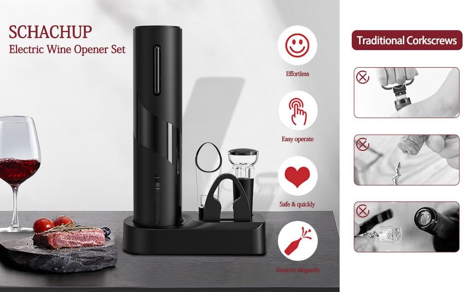 • Effizient und praktisch: Entfernen Sie Korken mühelos in nur 5 Sekunden, sodass jeder Vorgang reibungslos und ohne Beschädigungen abläuft. Mit nur einem Knopfdruck können Sie Flaschen schnell und mühelos öffnen, sodass auch Menschen mit Arthritis