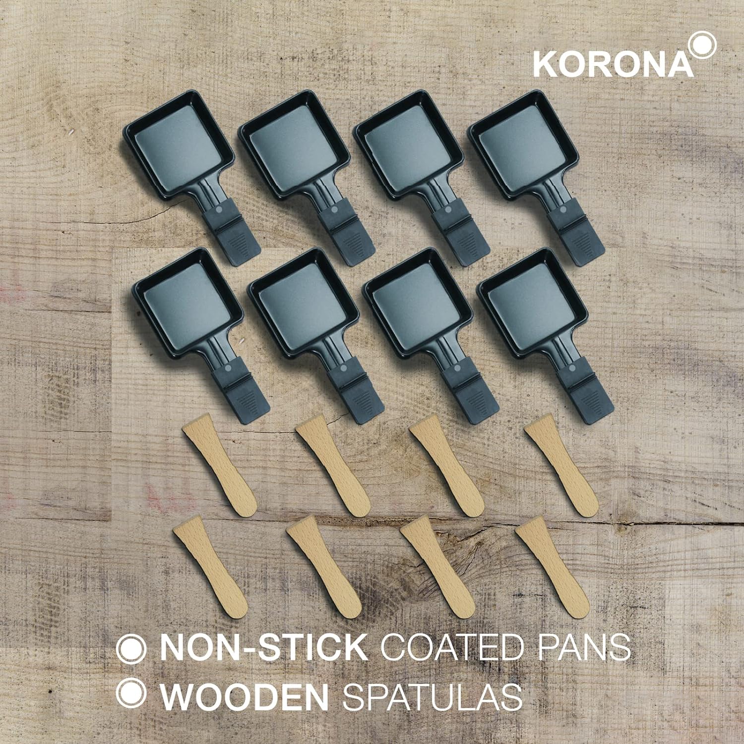 - ✅ ZUBEHÖR INKLUSIVE - Um direkt loslegen zu können, sind im Lieferumfang neben 8 Pfännchen auch 8 Holzspatel enthalten.