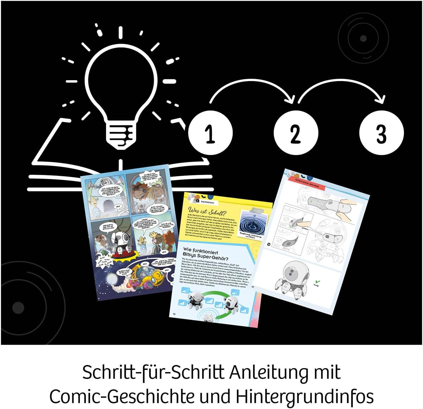 • Der Roboter besteht aus über 100 Teilen, die die Kinder selbst zusammensetzen. Dabei hilft die Anleitung, die mit vielen Aufbaubildern zeigt, wie es sicher klappt!
