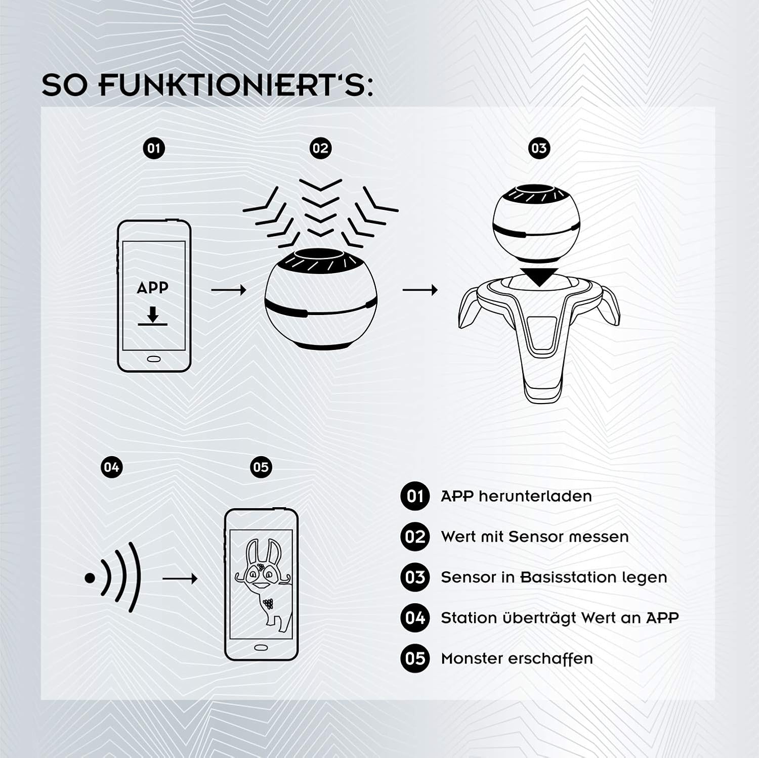 - Mit den Messwerten der Temperatur-, Sound- und Lichtsensoren, immer wieder neue Monster in der kostenlosen App zum Leben erwecken