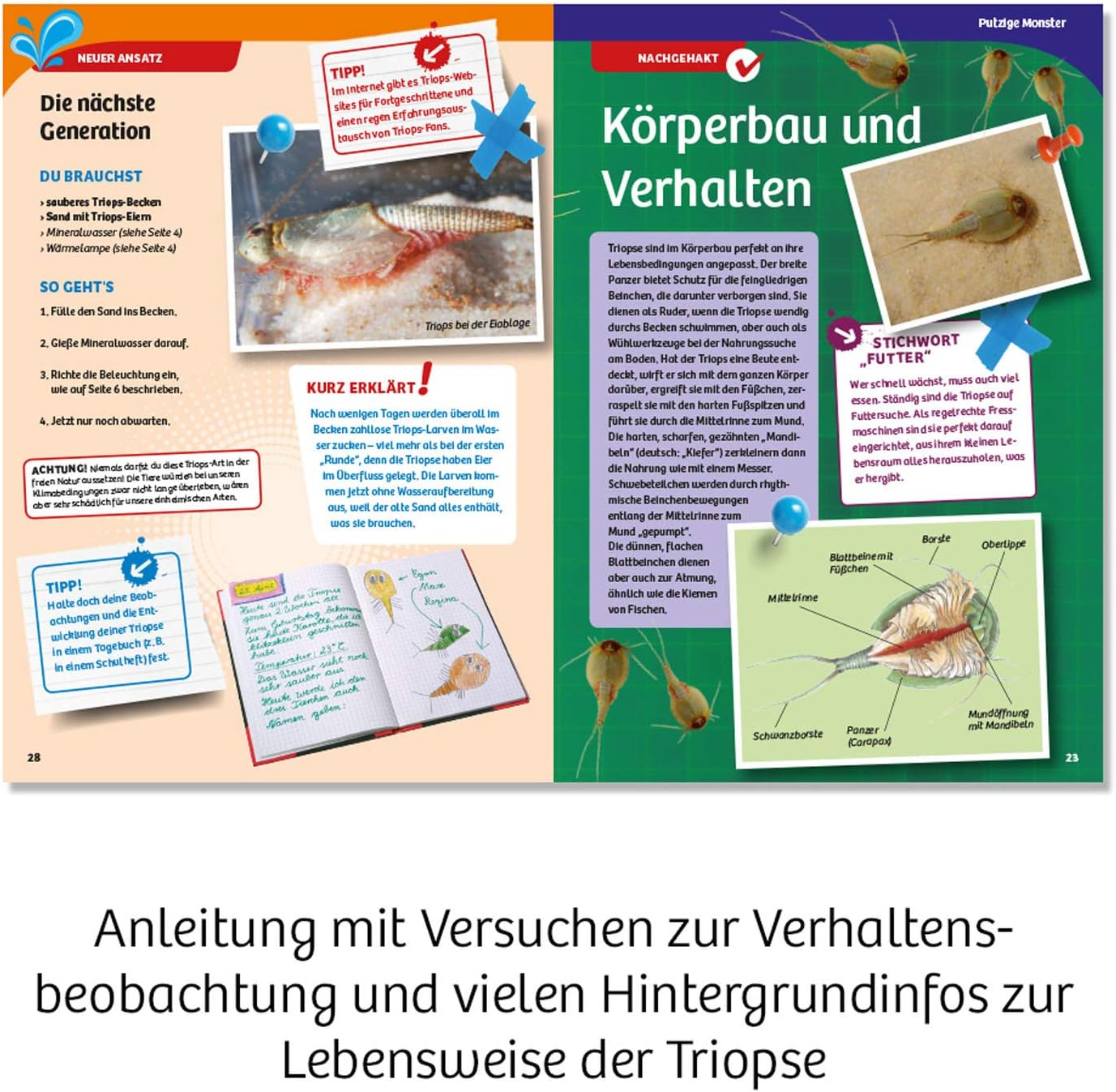 - Im Anleitungsheft wird die Aufzucht und Pflege der Triopse Schritt für Schritt erklärt und es hält spannende Versuche zum Verhalten der Tiere bereit