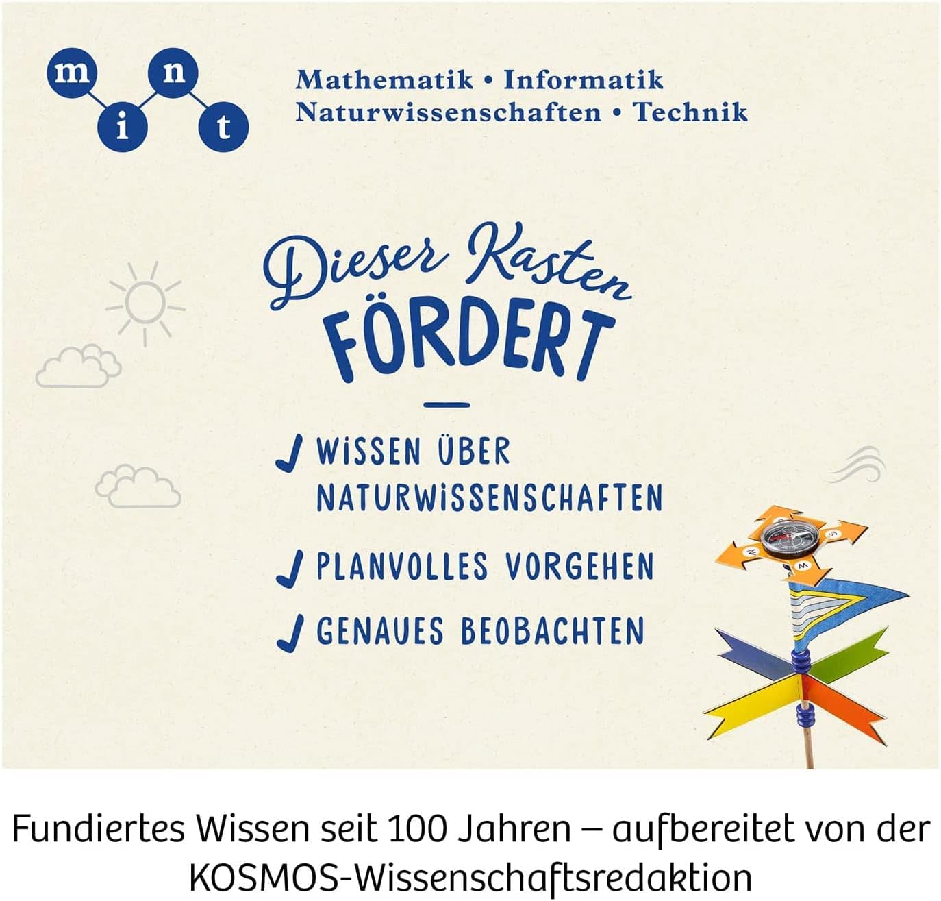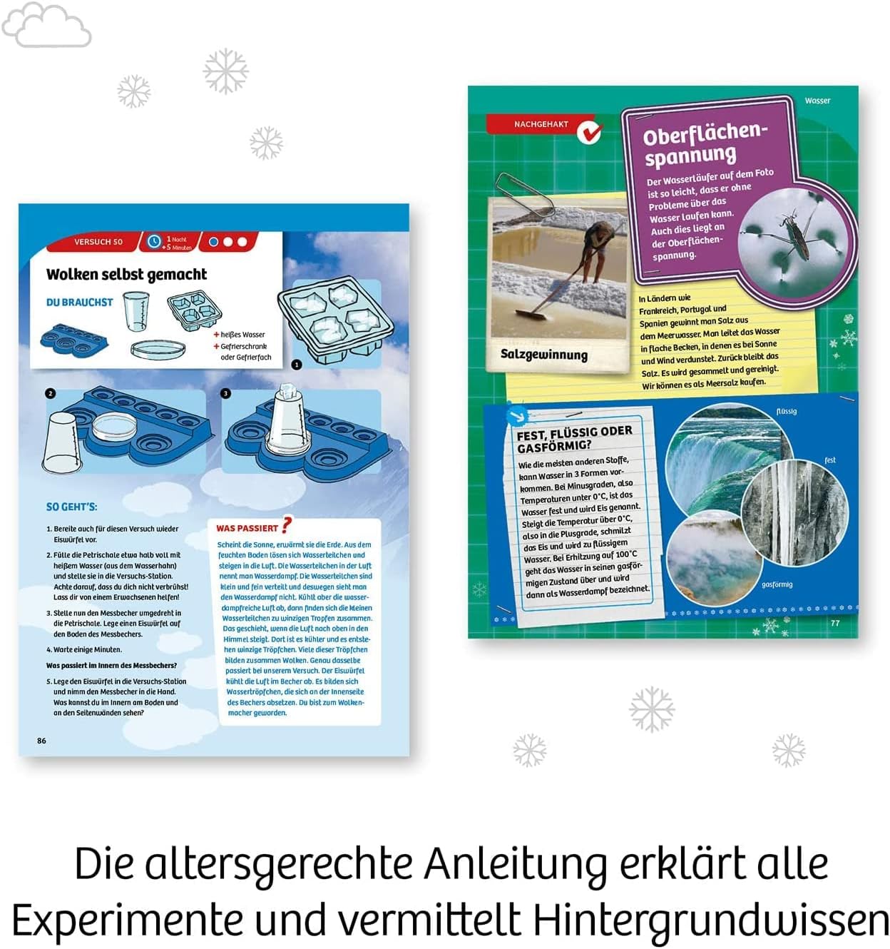- Der Wissenskick mit Spass und Aha-Effekten – die über 50 Versuche rund um Wasser, Luft, Sinne und mehr sind am schulischen Lehrplan orientiert und ermöglichen selbstständiges, nachhaltiges Experimentieren und Lernen