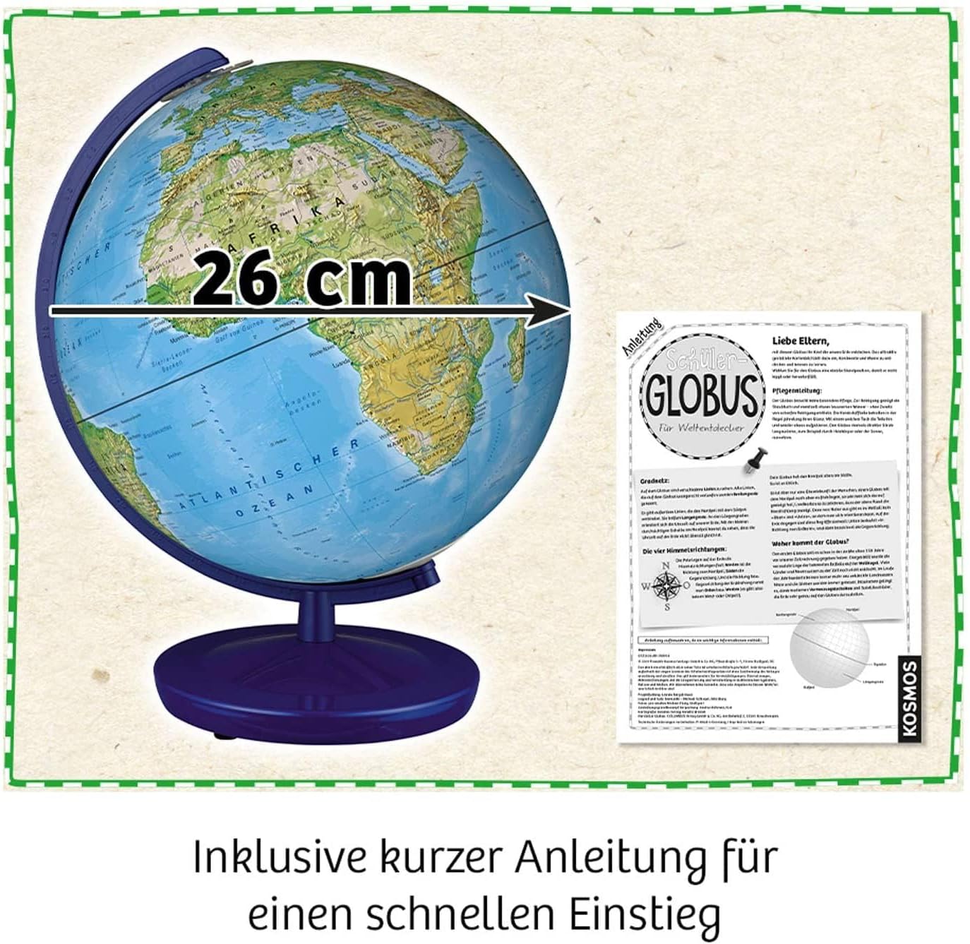 • Der KOSMOS Globus ermöglicht mit seinem hochwertigen physischen Kartenbild ein schnelles und intuitives Orientieren auf der Weltkugel.