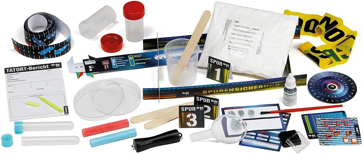 • Inhalt: UV-Lampe und Geheimstift, Absperr- und Massband, Gips, Stempelkissen, Fingerabdruckpulver und –Folie, Lupe und Tatortblock, Kreide, Pinsel & Pinzette, Codierscheiben