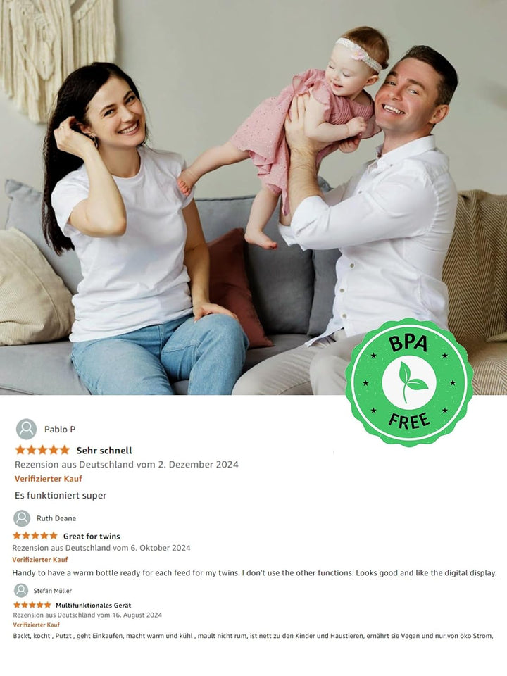 - Tolles Design und super Funktionen. Sanfte Erwärmung ist bei einer Temperatur von 40 ° C möglich um Nährstoffverluste zu vermeiden. Zum vorbereiten von Babybrei und alles ist die Maschiene sehr geeignet. 1 Jahr kein Grund zur Rückgabe oder zum