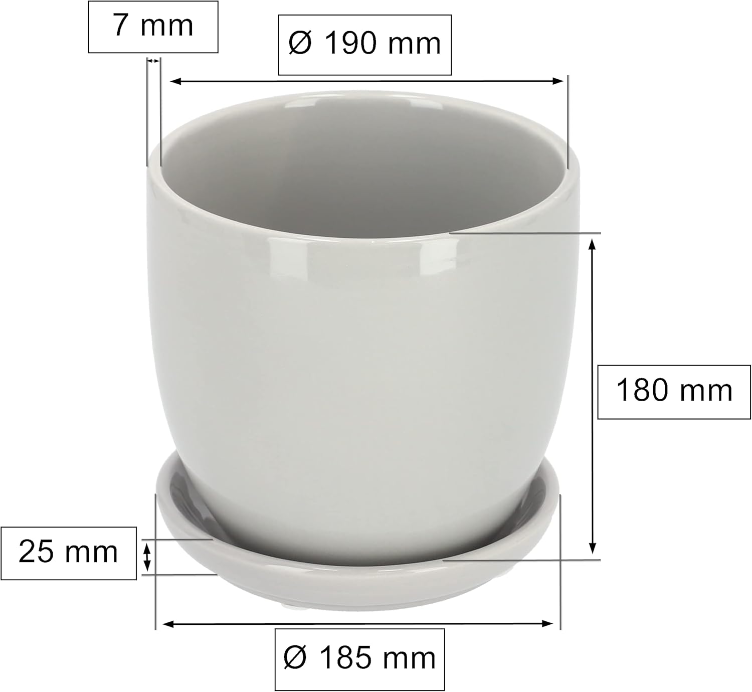 • TECHNISCHE DATEN - Blumentopf Grau 20 cm – Höhe: 180 mm, Wandstärke: 7 mm, Durchmesser: 190 mm, Höhe der Tropfschale: 25 mm, Durchmesser der Tropfschale: 185 mm, Farbe: Grau, Material: glasierte Keramik, Gewicht: 1784 g