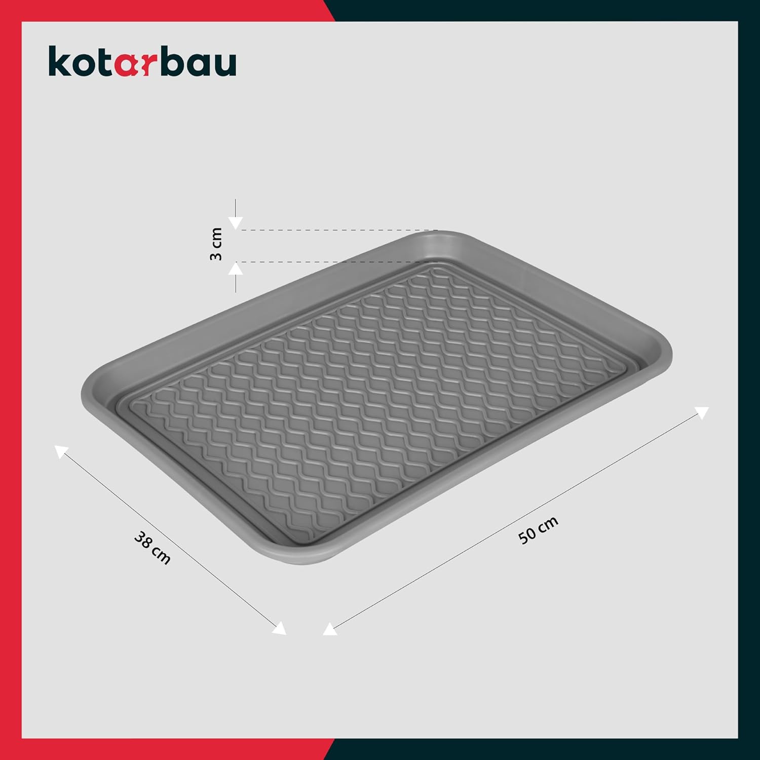 • TECHNISCHE DATEN - Schuhabtropfschale klein 38 x 50 cm - Länge: 50 cm, Breite: 38 cm, Höhe: 3 cm, Gewicht: 0,75kg, Material: Kunststoff, Farbe: Grau.