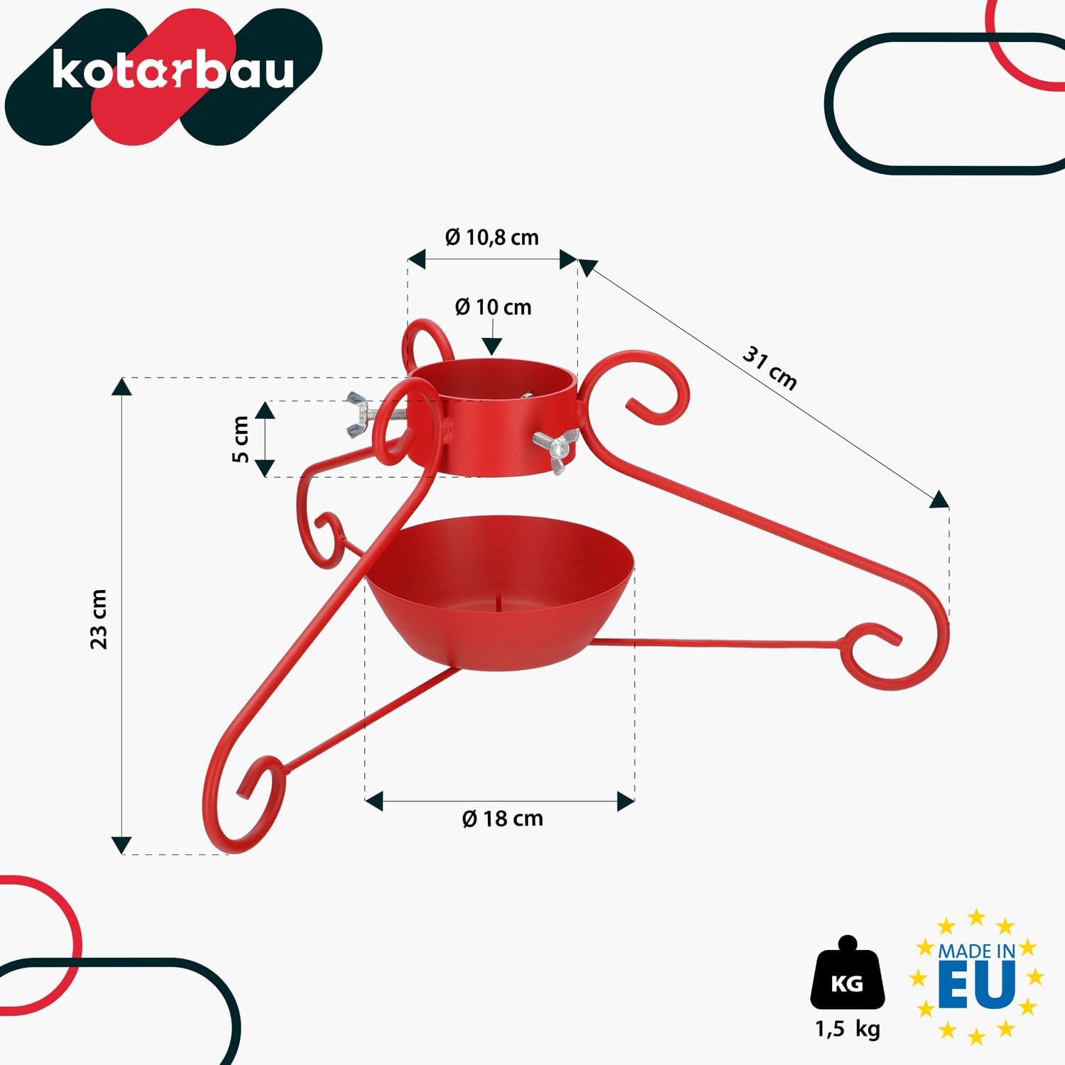 - TECHNISCHE DATEN: Höhe: 23 cm, Beinlänge: 31 cm, Weihnachtsbaum-Reifen: 10,8 cm, Bügelhöhe: 5 cm, maximaler Durchmesser des Weihnachtsbaumstamms: 10 cm, Wasserbehälter: 18 cm, Gewicht: 1,5 kg, Farbe: rot. / * Alle im Angebot enthaltenen Fotos werden