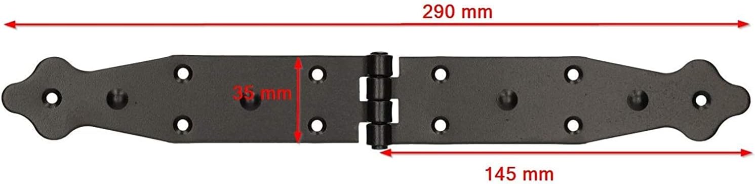 - TECHNISCHE DATEN - Gesamtlänge des Scharniers: 290 mm – Breite des Scharniers: 35 mm – Länge des Flügels von der Mitte des Scharniers: 145 mm – Stärke des Materials: 2 mm – Montagelöcher: 10 x 4 mm – Farbe: Schwarz – Material: Stahl –
