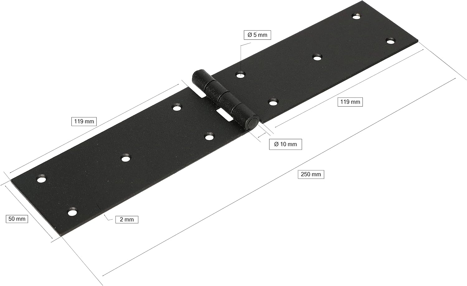 - TECHNISCHE DATEN - Scharnier 250x50 mm – Gesamtlänge: 250 mm, Flügellänge I: 119 mm, Flügellänge II: 119 mm, Breite: 50 mm, Durchmesser Montageöffnung: 5 mm, Achsendurchmesser: 10 mm, Stärke: 2 mm, Material: Stahl, Gewicht: 0,203 kg
