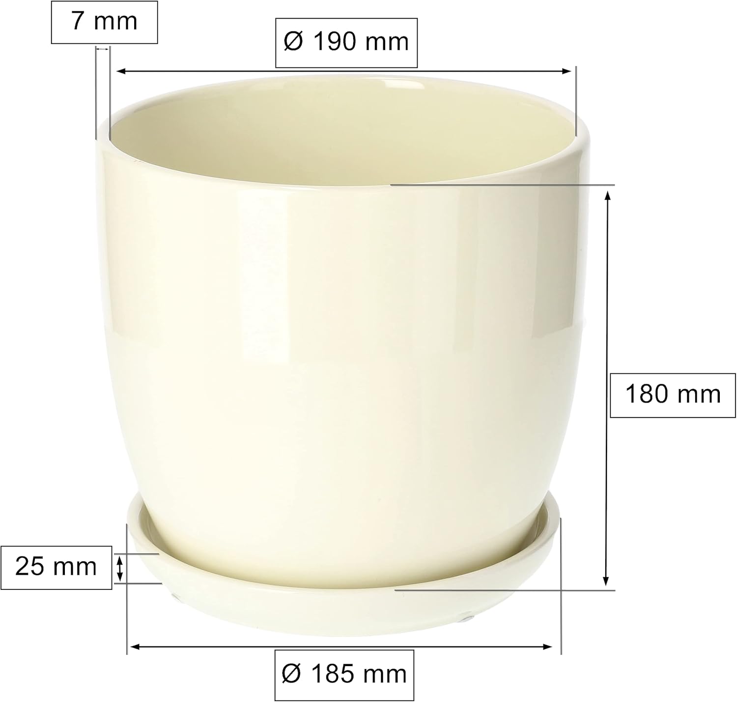 - TECHNISCHE DATEN - Blumentopf Beige 20 cm – Höhe: 180 mm, Wandstärke: 7 mm, Durchmesser: 190 mm, Höhe der Tropfschale: 25 mm, Durchmesser der Tropfschale: 185 mm, Farbe: Beige, Material: glasierte Keramik, Gewicht: 1852 g