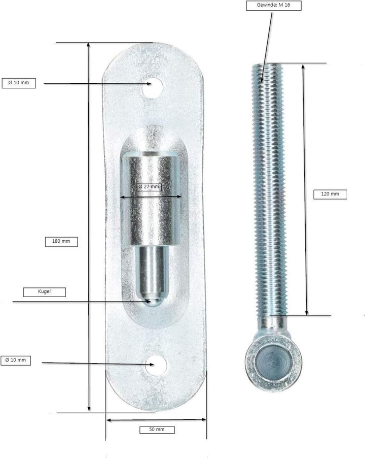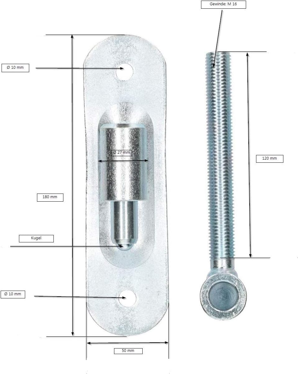 - TECHNISCHE DATEN – ( Ø27 M16 ) Material: Stahl – Oberfläche: verzinkt – Gewicht: 972 g (1 .stk ) – Gewindelänge: 120 mm – Gewindedurchmesser: M16 mm – Montageöffnungen: 2 x Ø 10 mm – GENAUE DETAILS AUF DER SKIZZE ( Fotos / Bilder )