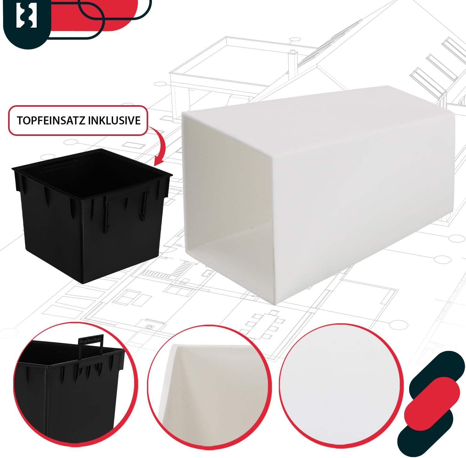 - TECHNISCHE DATEN – Blumentopf 290x290x545 – Höhe Übertopf: 545 mm, Wandlänge Unterkante Übertopf: 225 mm, Wandlänge Oberkante Übertopf: 290 mm, Farbe: Weiss, Innentopf: 265x265x225 mm, Gewicht: 2,034 kg