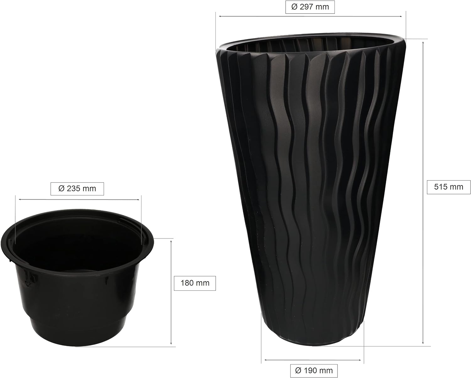 - TECHNISCHE DATEN – Blumentopf Anthrazit – Höhe: 515mm, Durchmesser Oberkante: 297mm, Durchmesser Unterkante: 190mm, Material: Kunststoff, Farbe: Anthrazit, Innentopf – Höhe: 180mm, Durchmesser Oberkante: 235mm, Farbe: Schwarz, Gewicht Set: 1kg