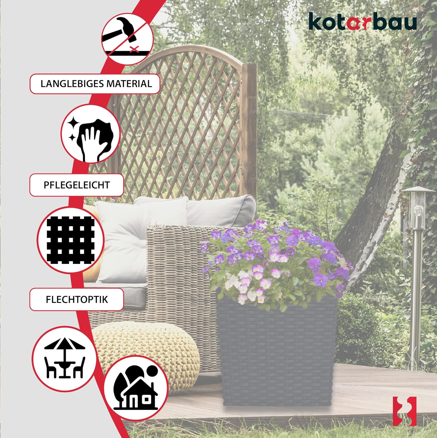- LANGJÄHRIGE NUTZUNG – Der KOTARBAU Pflanzkübel hat ein Muster, das Weidengeflecht imitiert, was es elegant und originell macht. Er besteht aus Kunststoff und ist daher beständig gegen niedrige Temperaturen, UV-Strahlung sowie Kratzer zudem ist das