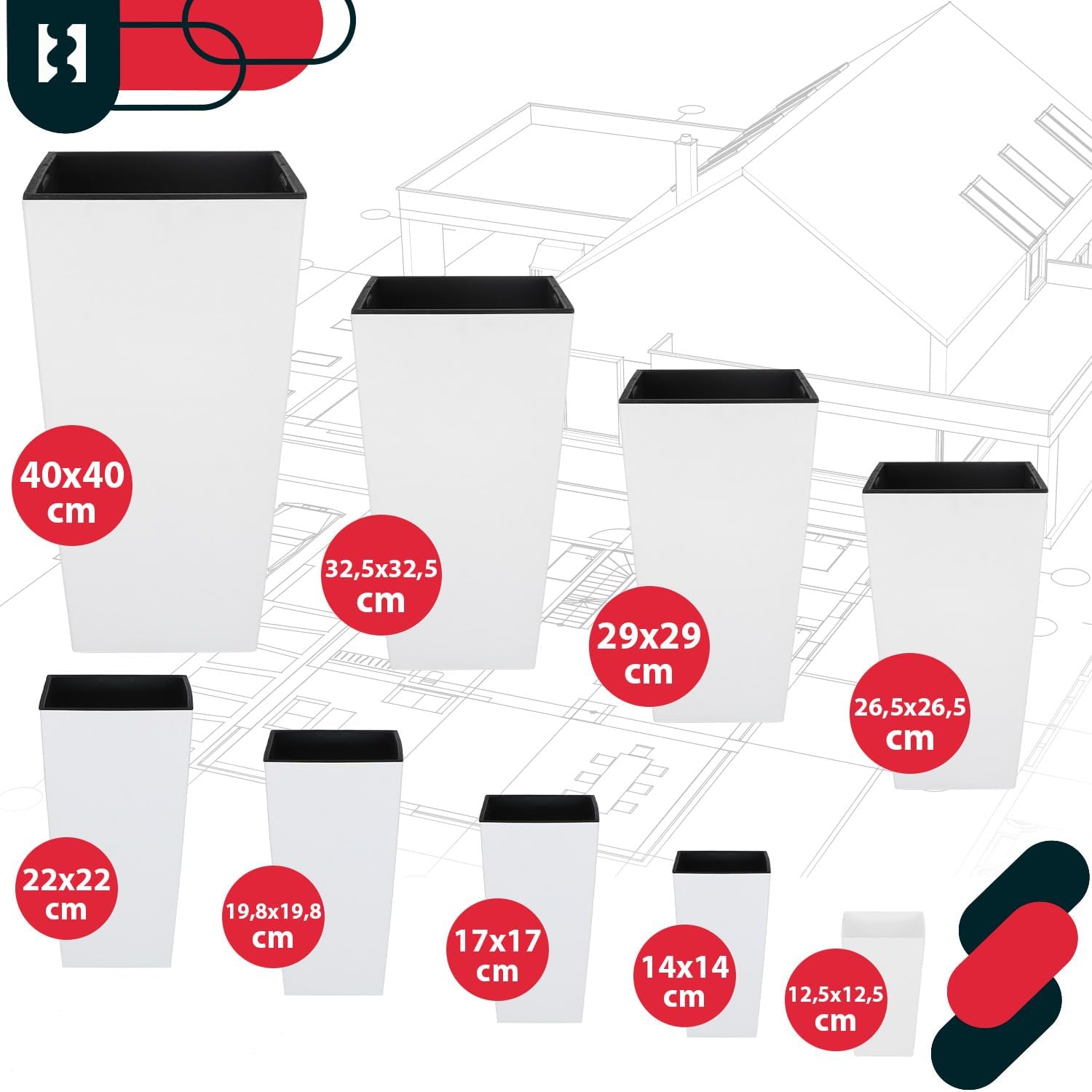 - TECHNISCHE DATEN – Blumentopf 400x400x750 – Höhe Übertopf: 750 mm, Wandlänge Unterkante Übertopf: 305 mm, Wandlänge Oberkante Übertopf: 400 mm, Farbe: Weiss, Innentopf: 360x360x315 mm, Gewicht: 4,960 kg