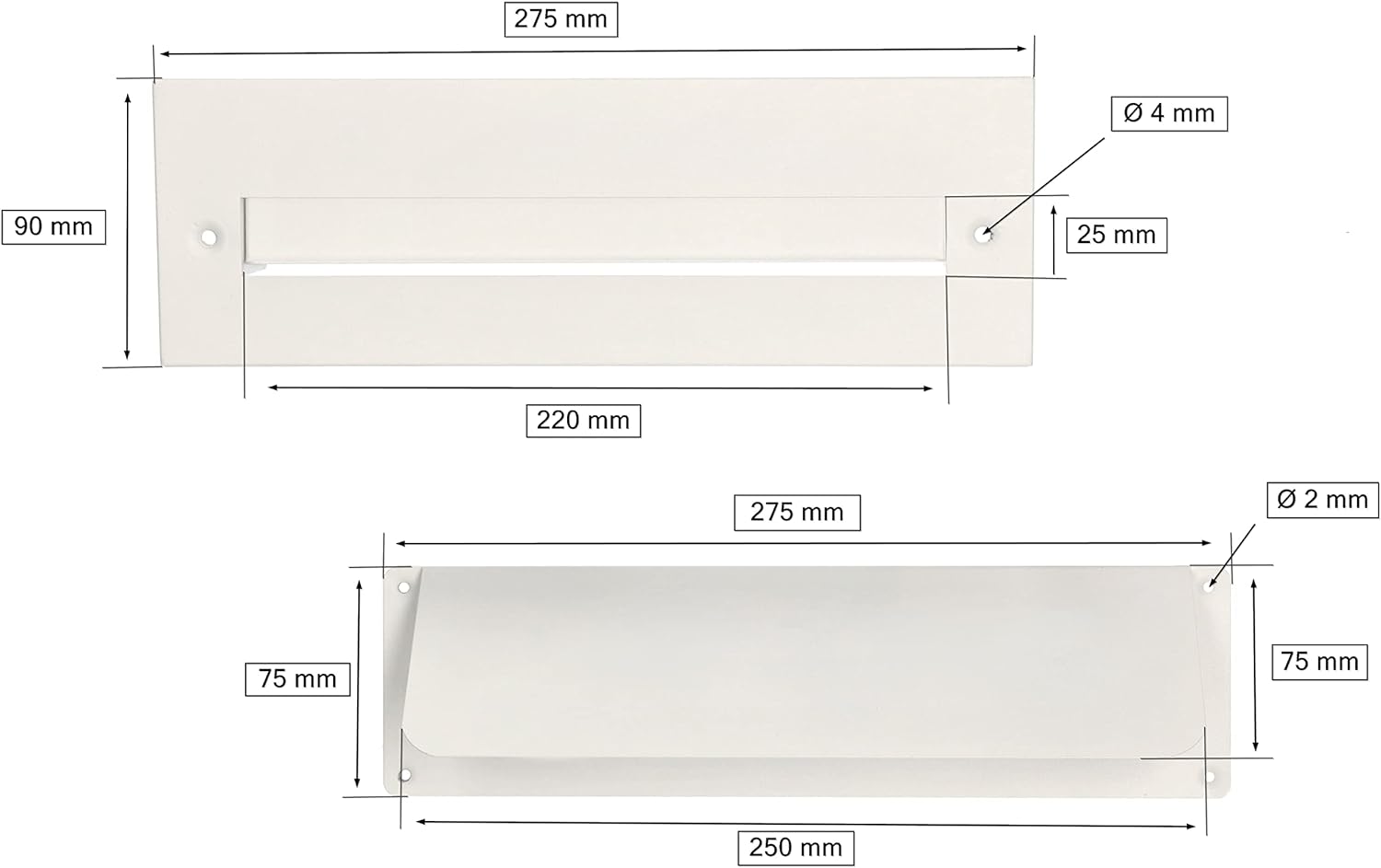 - TECHNISCHE DATEN - Briefeinwurf Weiss Teil I - Breite: 275 mm, Höhe: 90 mm, Abmessungen der Löcher: 220x25 mm, Durchmesser des Befestigungslochs: 4 mm Teil II - Gesamtbreite: 275 mm, Abmessungen des Deckels: 250x75 mm, Höhe: 75 mm, Durchmesser der