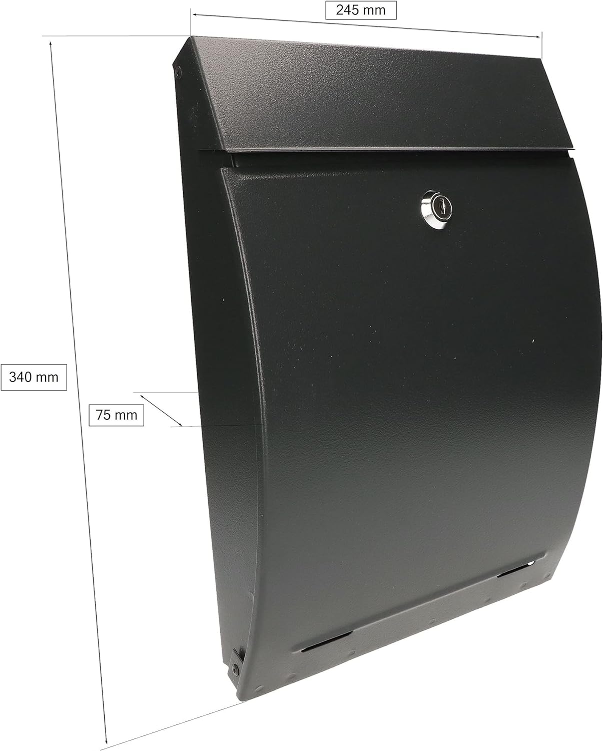 - TECHNISCHE DATEN – Briefkasten Anthrazit - Höhe: 340mm, Breite: 245mm, Tiefe: 75mm, Einwurfmasse: 235x25mm, Abstand Montagelöcher: 172/152mm, Material: verzinkter Stahl, Oberfläche: pulverbeschichtet, Farbe: Anthrazit, Gewicht: 1,535kg