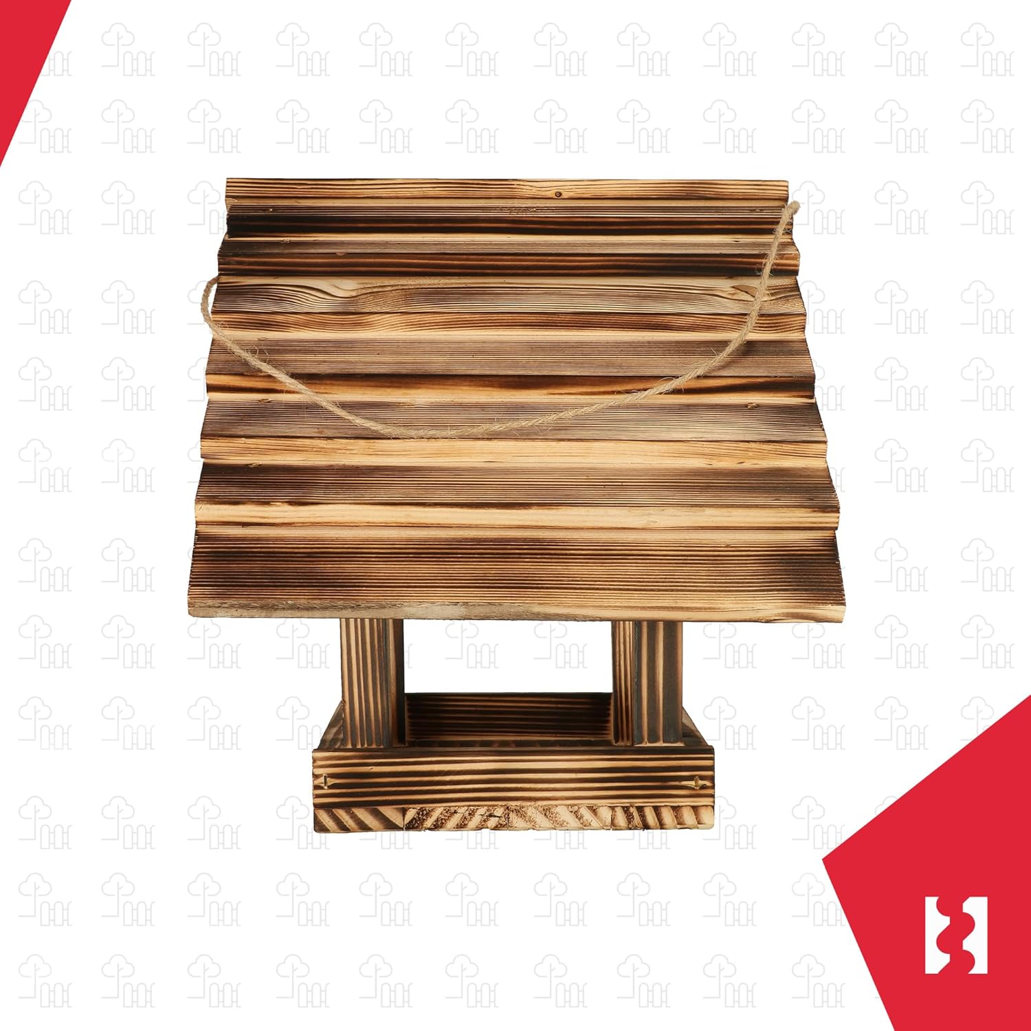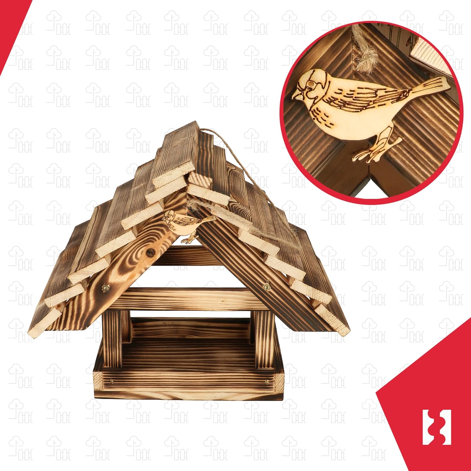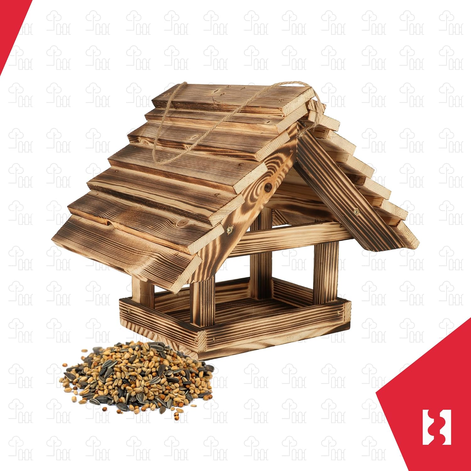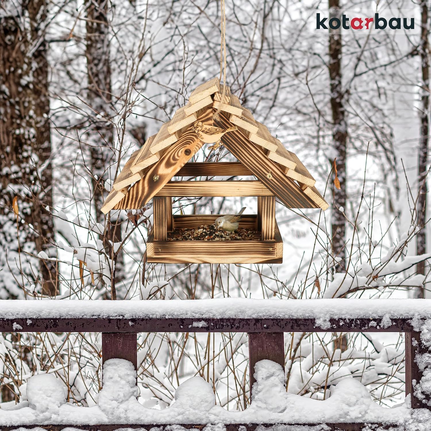 - DER KOTARBAU FUTTERSPENDER IST DURCH BRENNUNG IMPRÄGNIERT UND WIDERSTANDSFÄHIG GEGEN RAUE WITTERUNG. Das schräge Dach schützt es vor Feuchtigkeit, Schnee und Regen. Das Futterhaus hat die Form eines schmucken Vogelhauses. Der breite Boden ermöglicht
