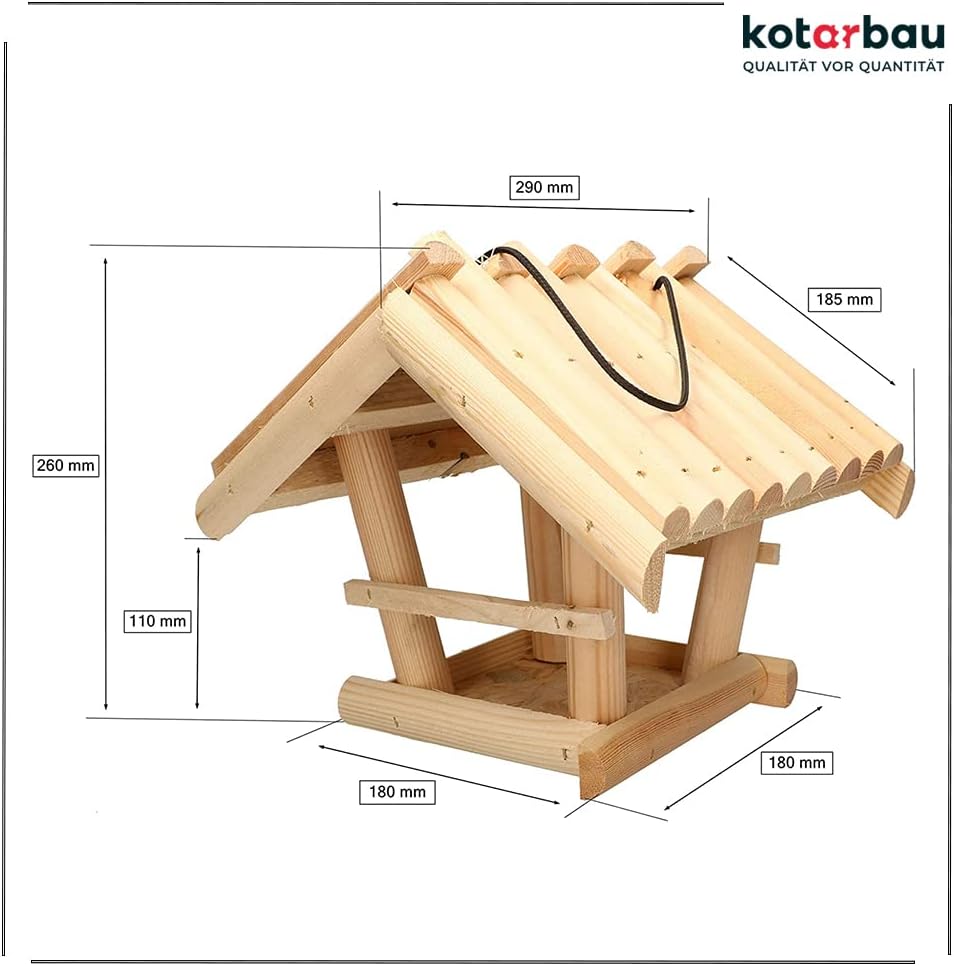 - TECHNISCHE DATEN - Unlackiert - Breite der Basis: 180 mm, Länge der Basis: 180 mm, Gesamthöhe: 260 mm, Länge der Überdachung: 290 mm, Material: Holz, Gewicht des Futterkasten: 1.450 kg, Gewicht des Futters: 0,5 kg Die genauen Abmessungen finden Sie