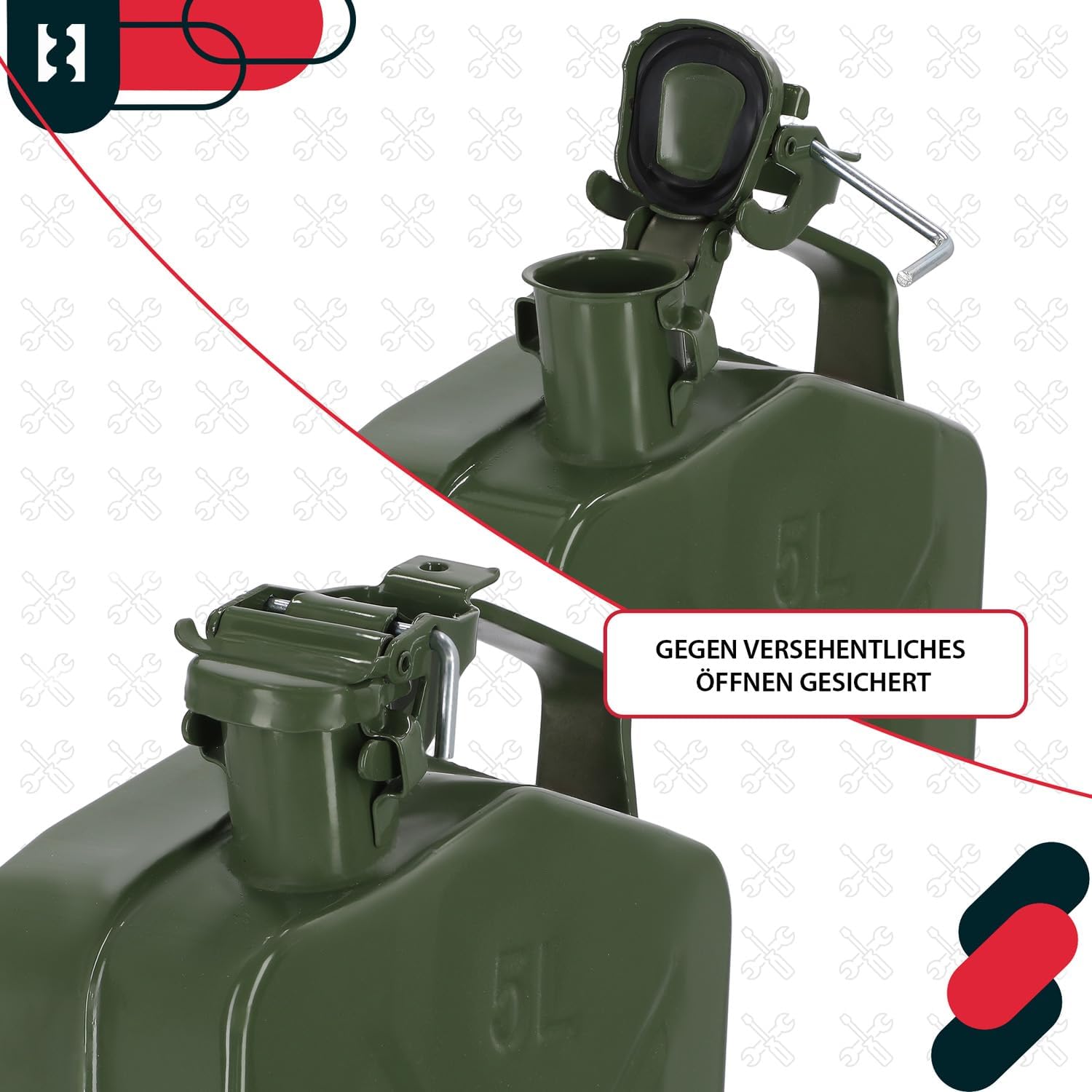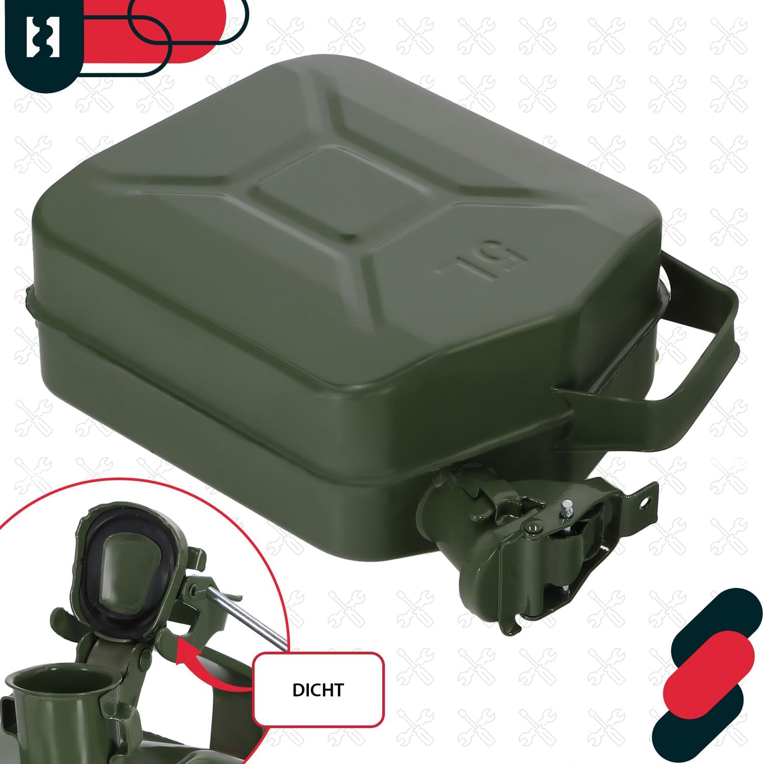 - TECHNISCHE DATEN – Kanister 5L – Fassungsvermögen: 5L, Masse: 310x230x100mm, Material: Stahl, Oberfläche: pulverbeschichtet, Farbe: Olivgrün, Gewicht: 1,280kg