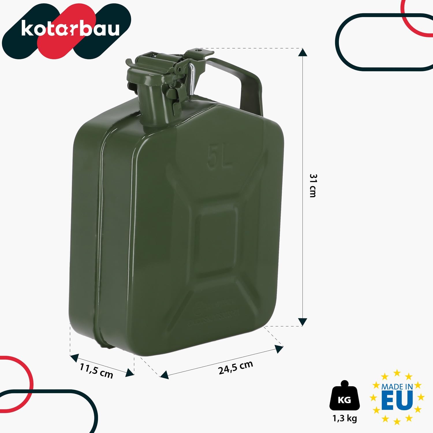 - HALTBARKEIT – Der professionelle KOTARBAU Benzinkanister ist aus beidseitig pulverbeschichtetem Stahl gefertigt. Er zeichnet sich durch hohe Haltbarkeit, Beständigkeit gegen hohe Temperaturen und mechanische Beschädigungen aus. Ausserdem ist er bei