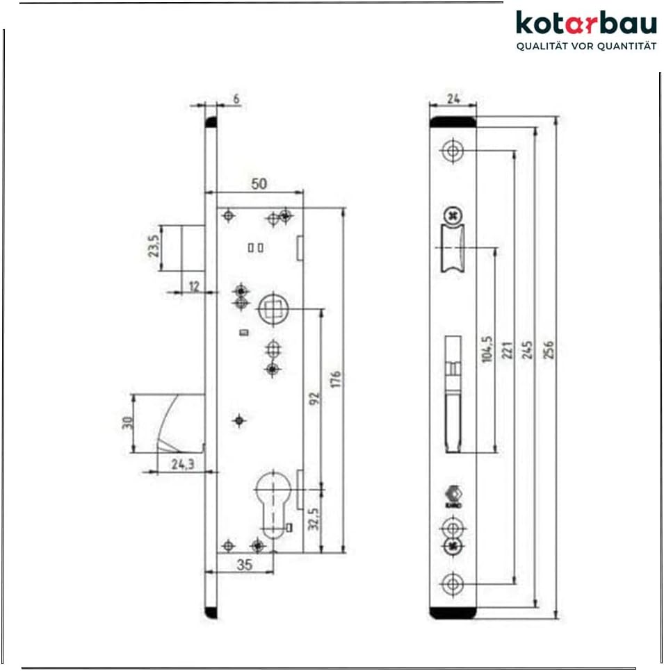 - TECHNISCHEN DATEN – Dornmass: 35 mm – Stulp: 24 mm – Abstand: 92 mm – Tiefe des Schlosses: 50 mm – Breite des Stulps: 6 mm – Höhe des Schloss: 176 mm – Gesamthöhe: 245 mm - Abstand zwischen Montagelöchern: 221 mm – Vierkant: 8 mm -